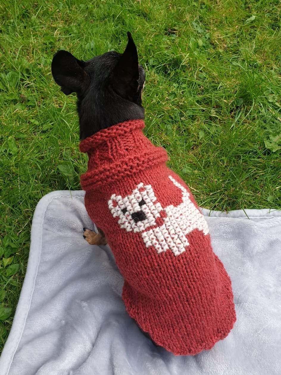 Super cute hand knitted dog sweater in pink with white pompoms and a hoodie. Perfect for colder weather because of warm yarn. Ideally suits smaller breeds such as chihuahua, russian toyterrier, pincher or yorkie, but we do make for any breed or even cats.