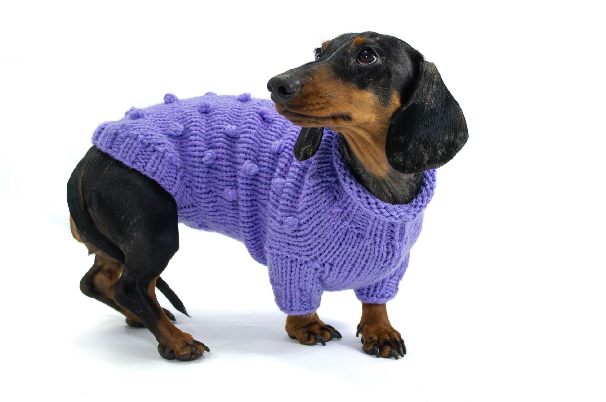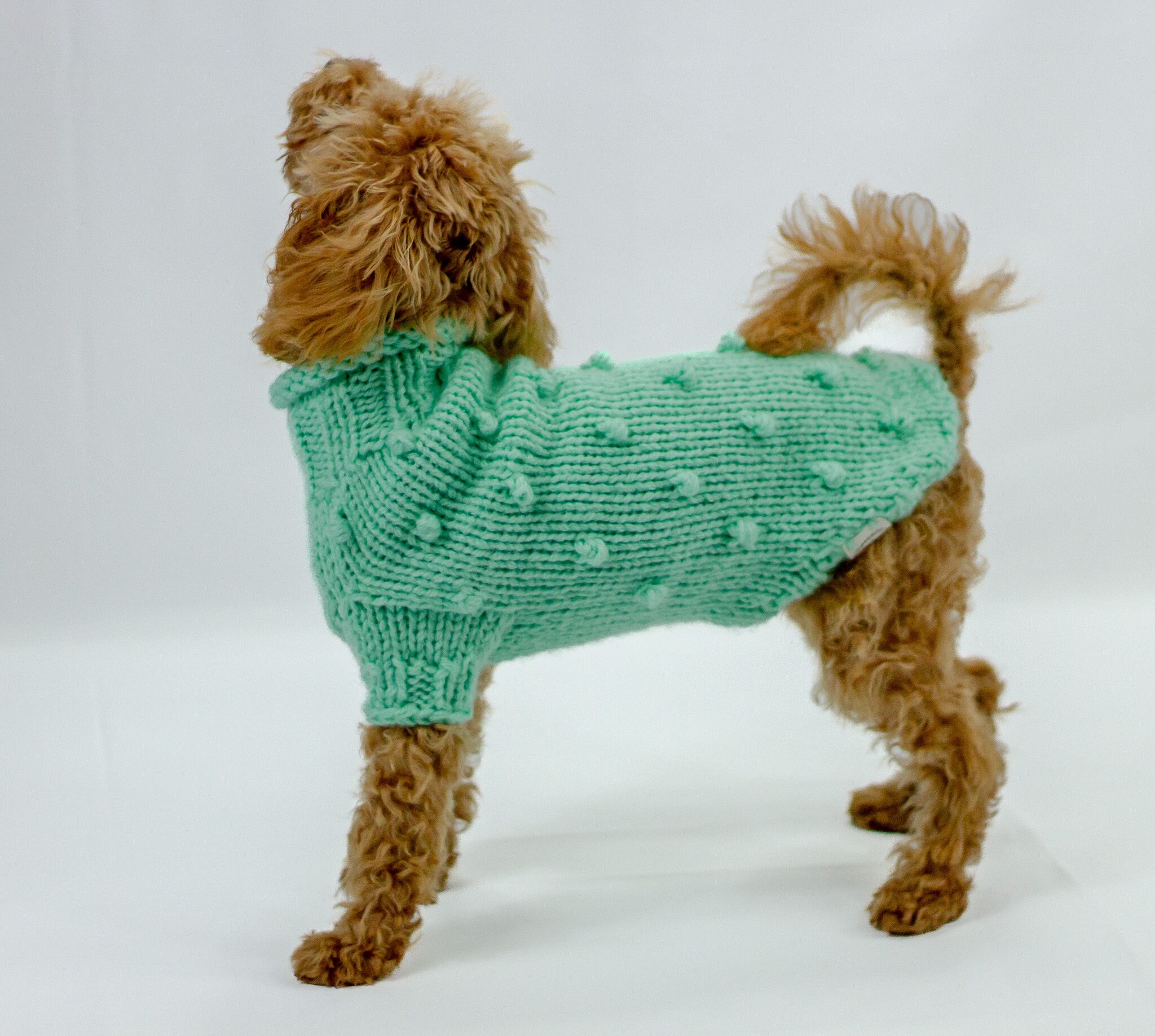 Our handknit wool dog sweater will be your dog’s favorite jumper! This cute handmade wool dog jumper with pompoms is knitted from quality wool blend and has long sleeves and a turtleneck. Get yours today!