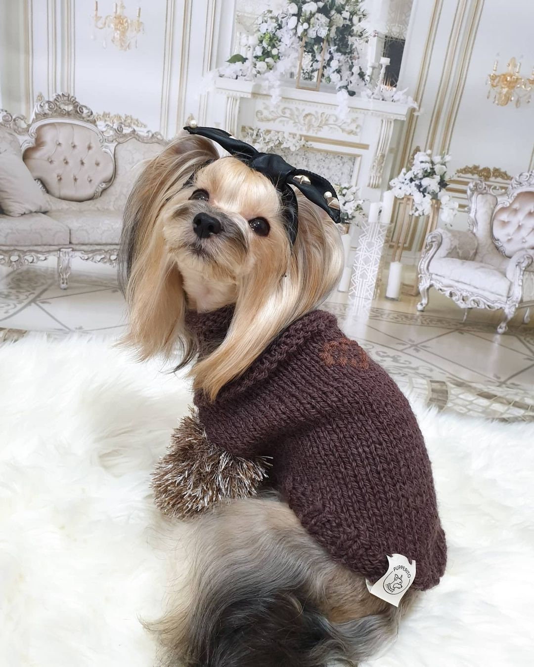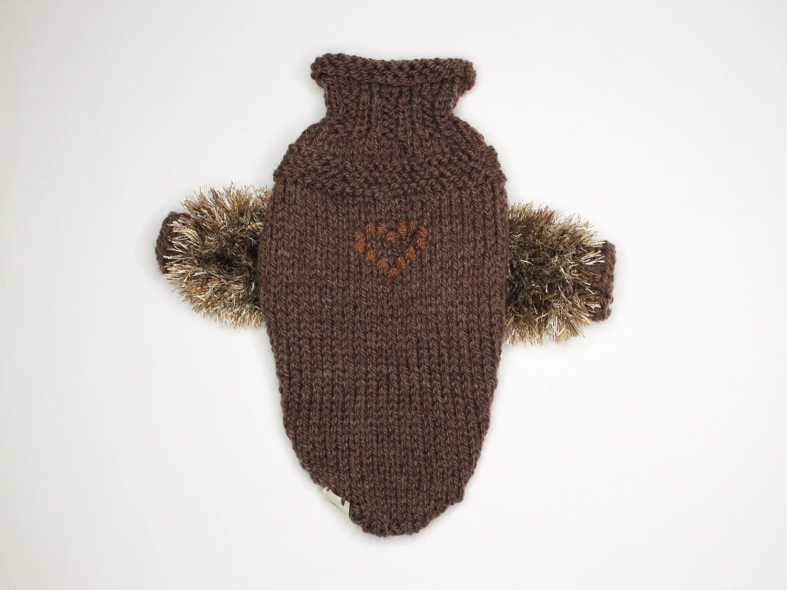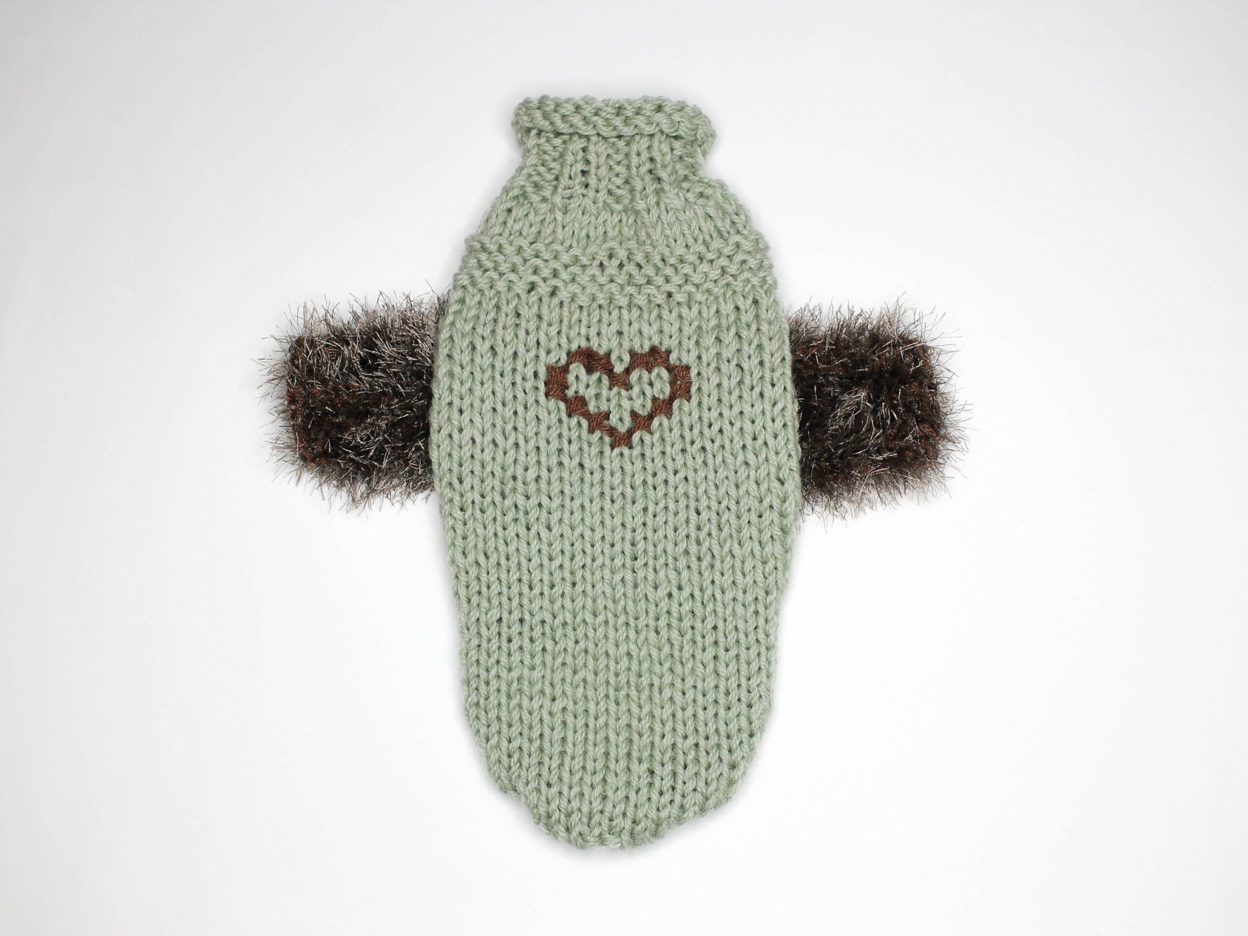 Handknitted dog sweater with fluffy arms in faux fur for small dogs in brown and gray. Embroidered heart makes it perfect for Valentine’s day or as a Valentine’s gift for your precious pet π
