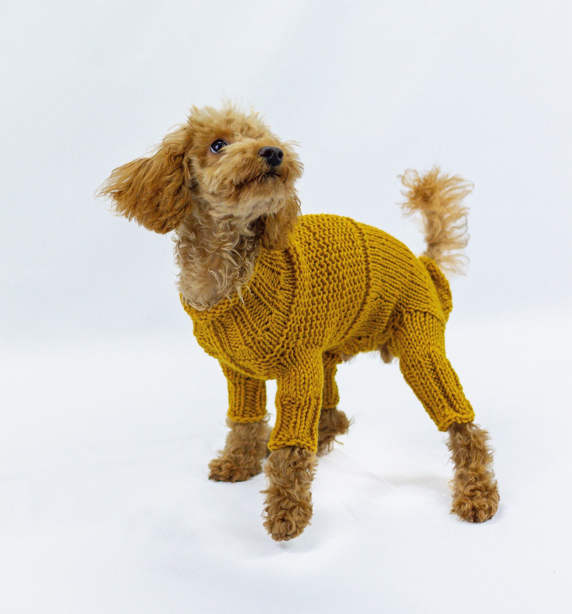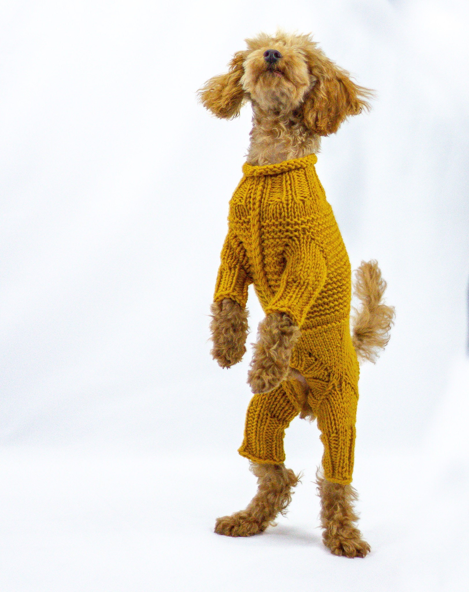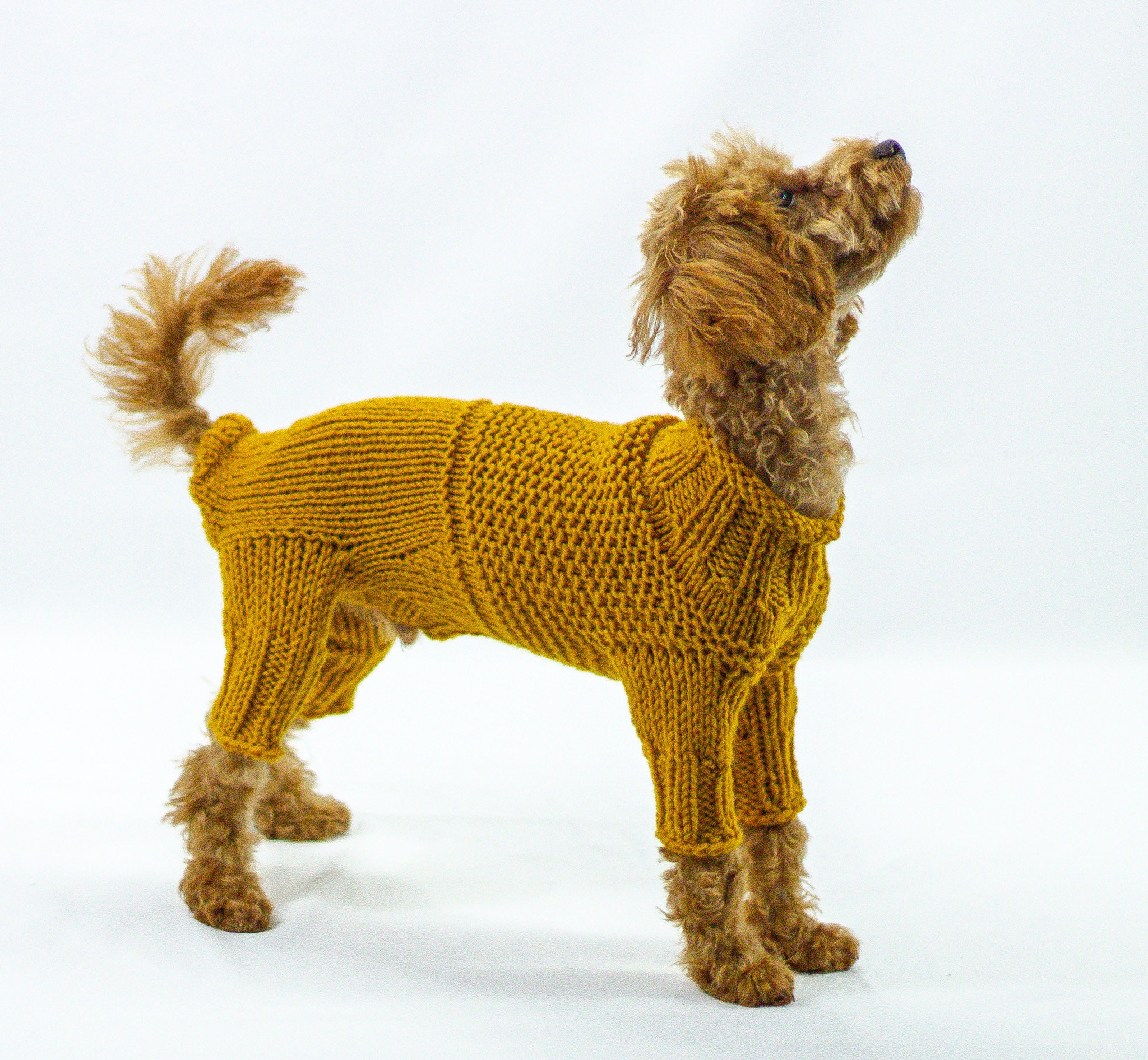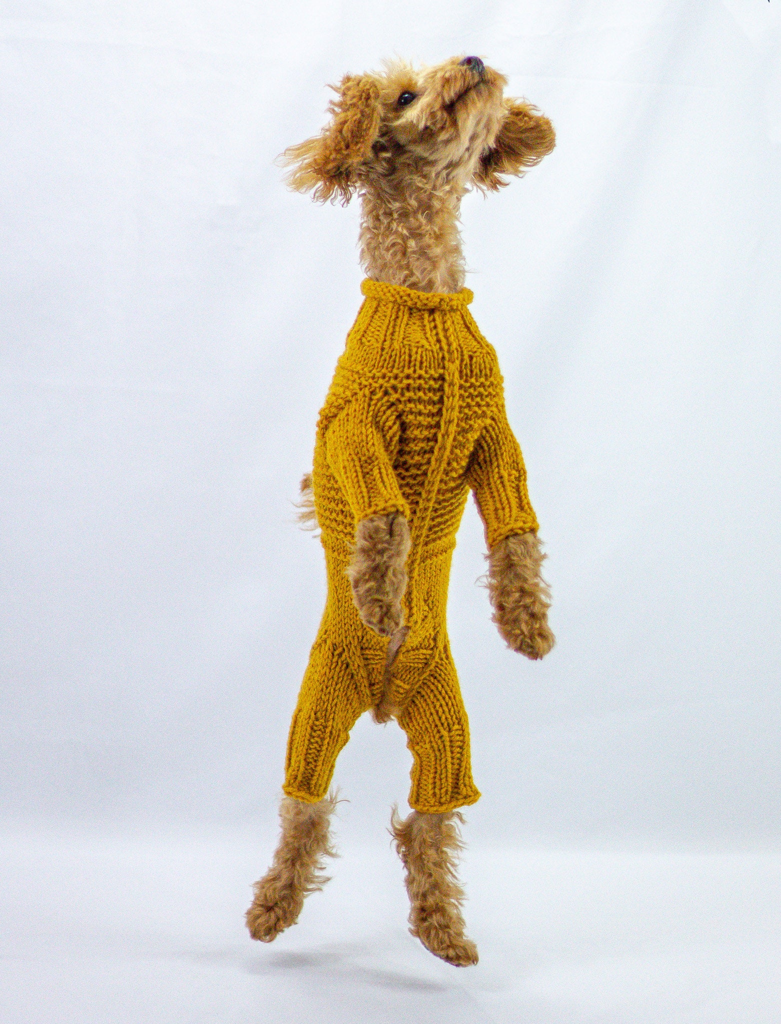 Handknitted mustard woolly dog jumpsuit for small dogs – very cosy and 100% handmade. Perfect for colder weather because of natural wool. Ideally suits smaller breeds such as chihuahua, russian toyterrier, pincher or yorkie, but we do make for any breed or even cats.