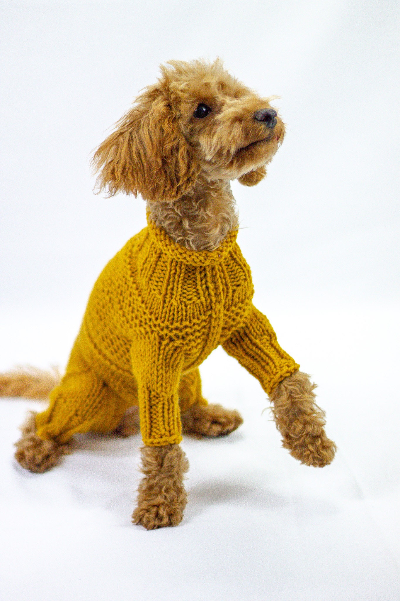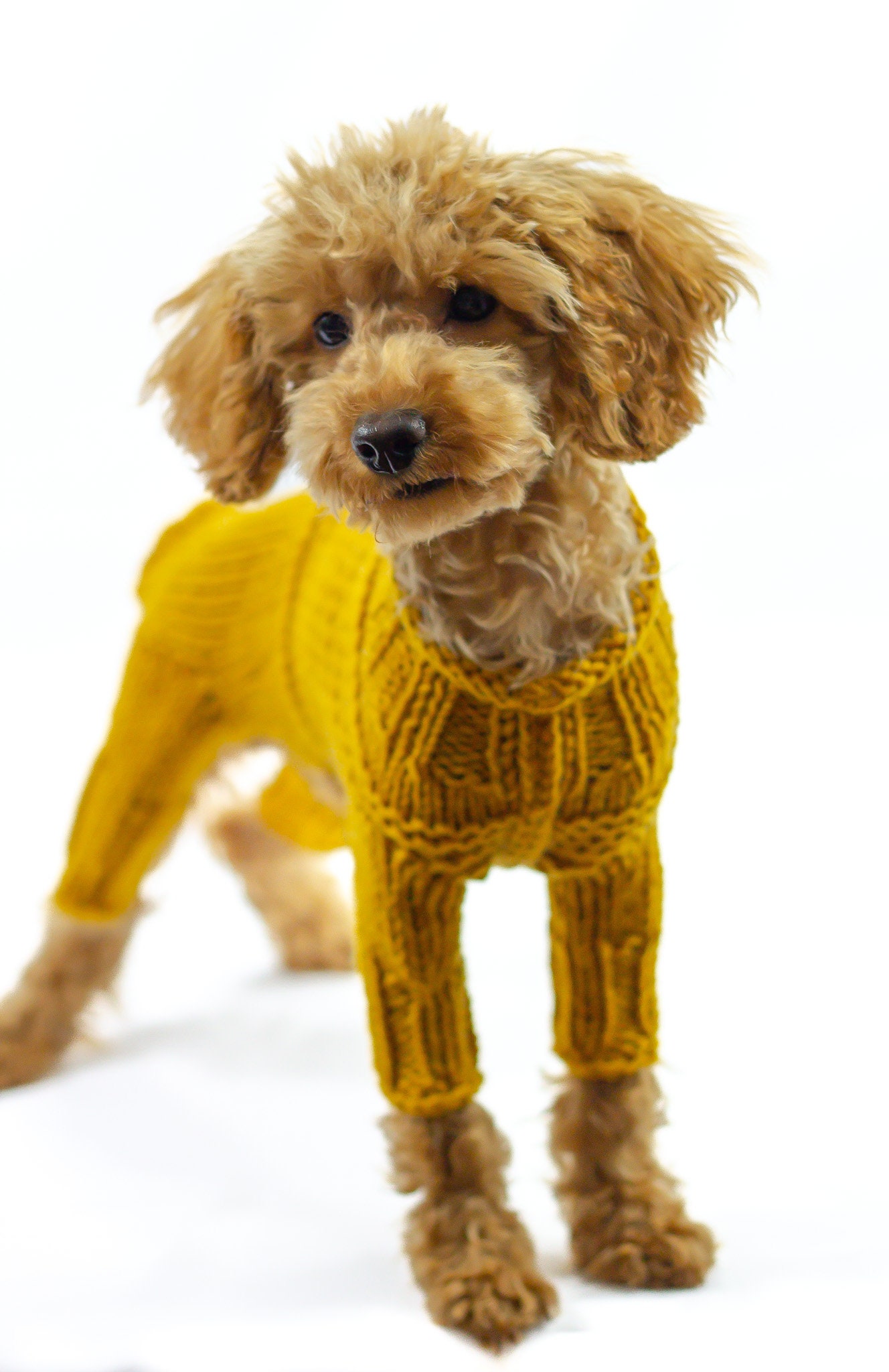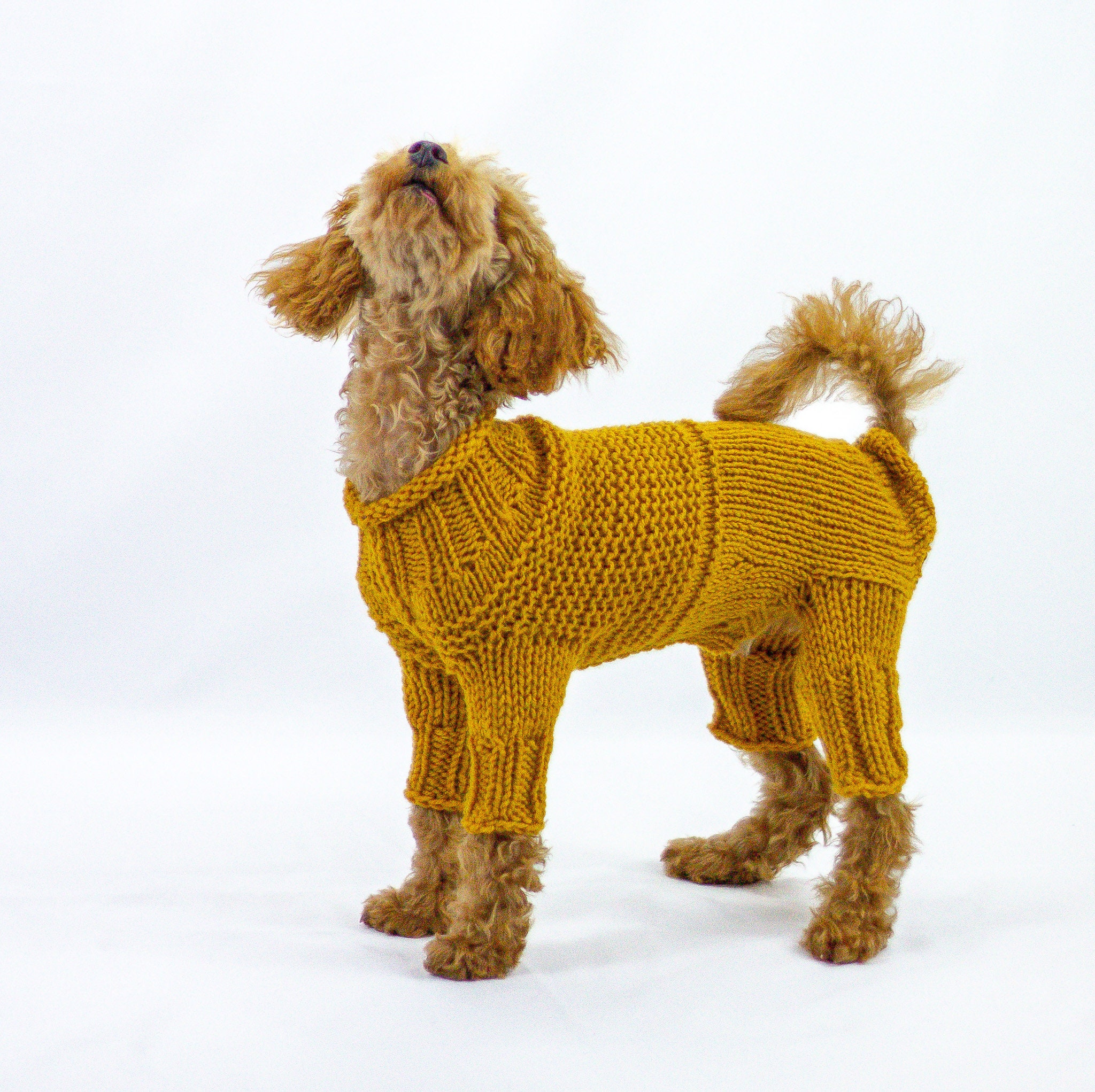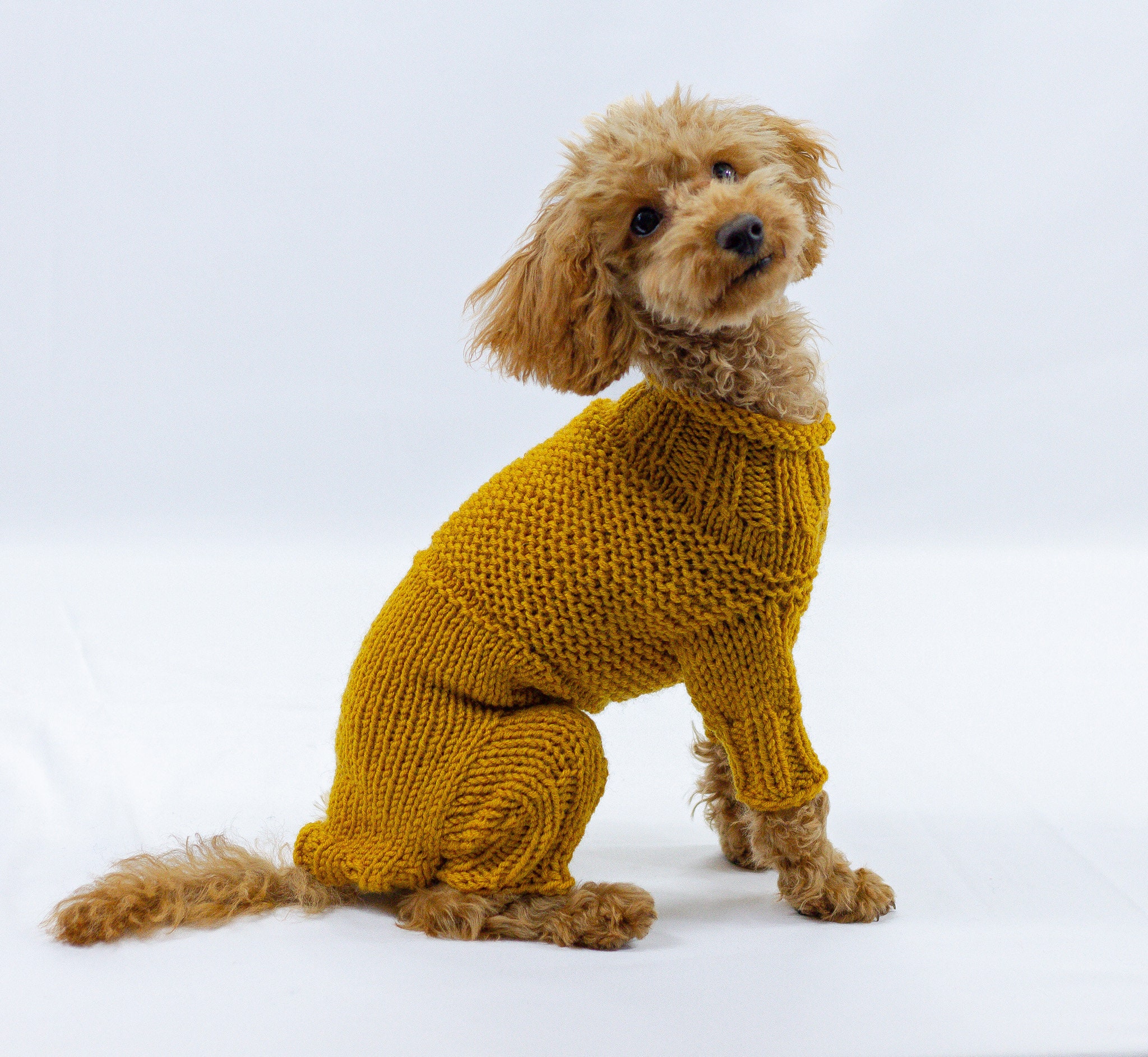 Handknitted mustard woolly dog jumpsuit for small dogs – very cosy and 100% handmade. Perfect for colder weather because of natural wool. Ideally suits smaller breeds such as chihuahua, russian toyterrier, pincher or yorkie, but we do make for any breed or even cats.