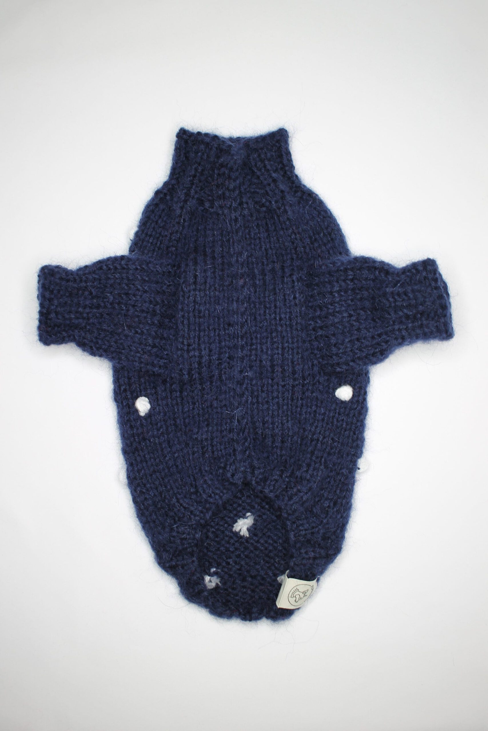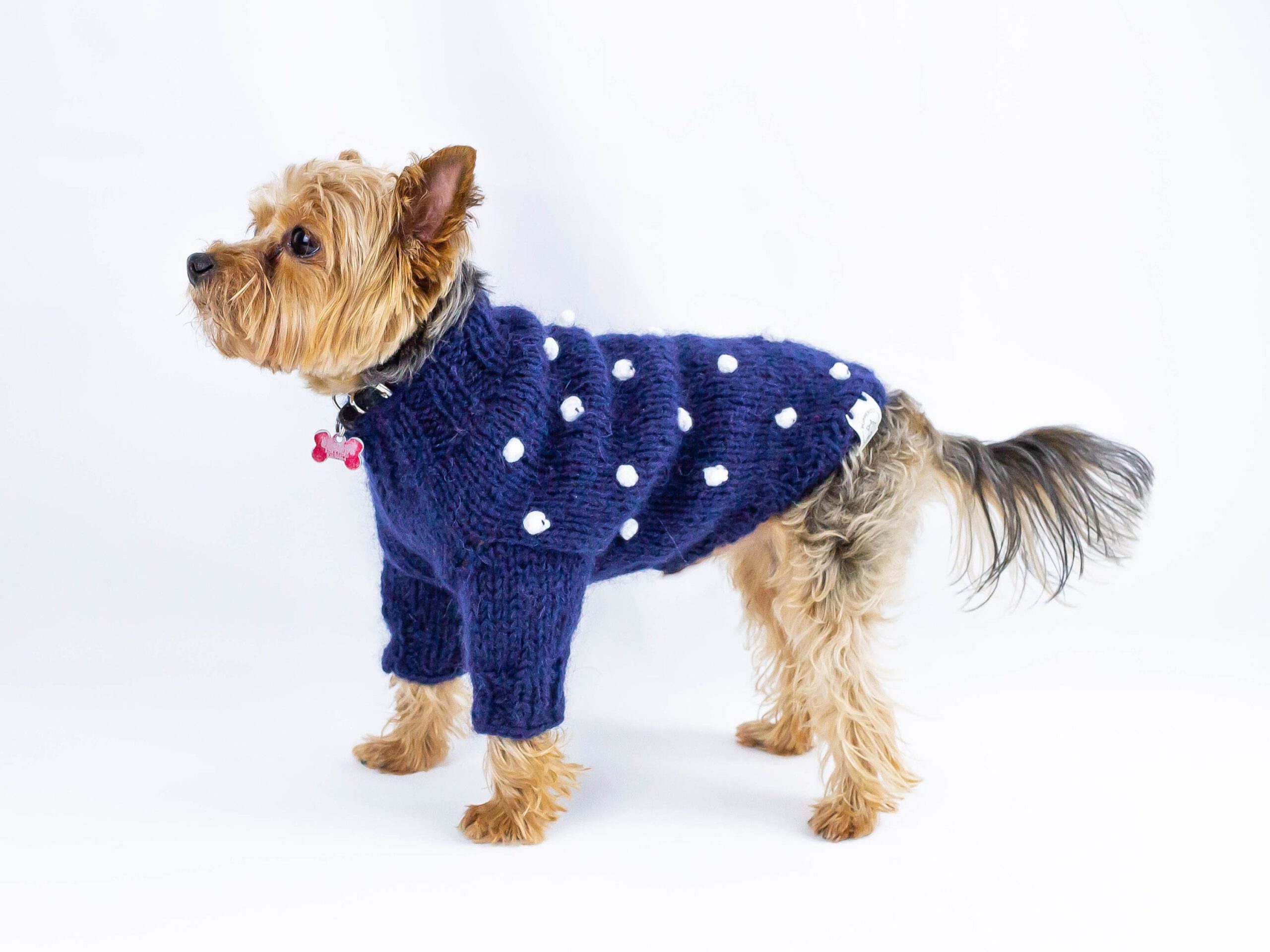 Handknitted wool sweater for small dogs with pompoms – super cute and warm in blue wool yarn. Perfect for colder weather because of warm yarn. Ideally suits smaller breeds such as chihuahua, russian toyterrier, pincher or yorkie, but we do make for any breed or even cats.