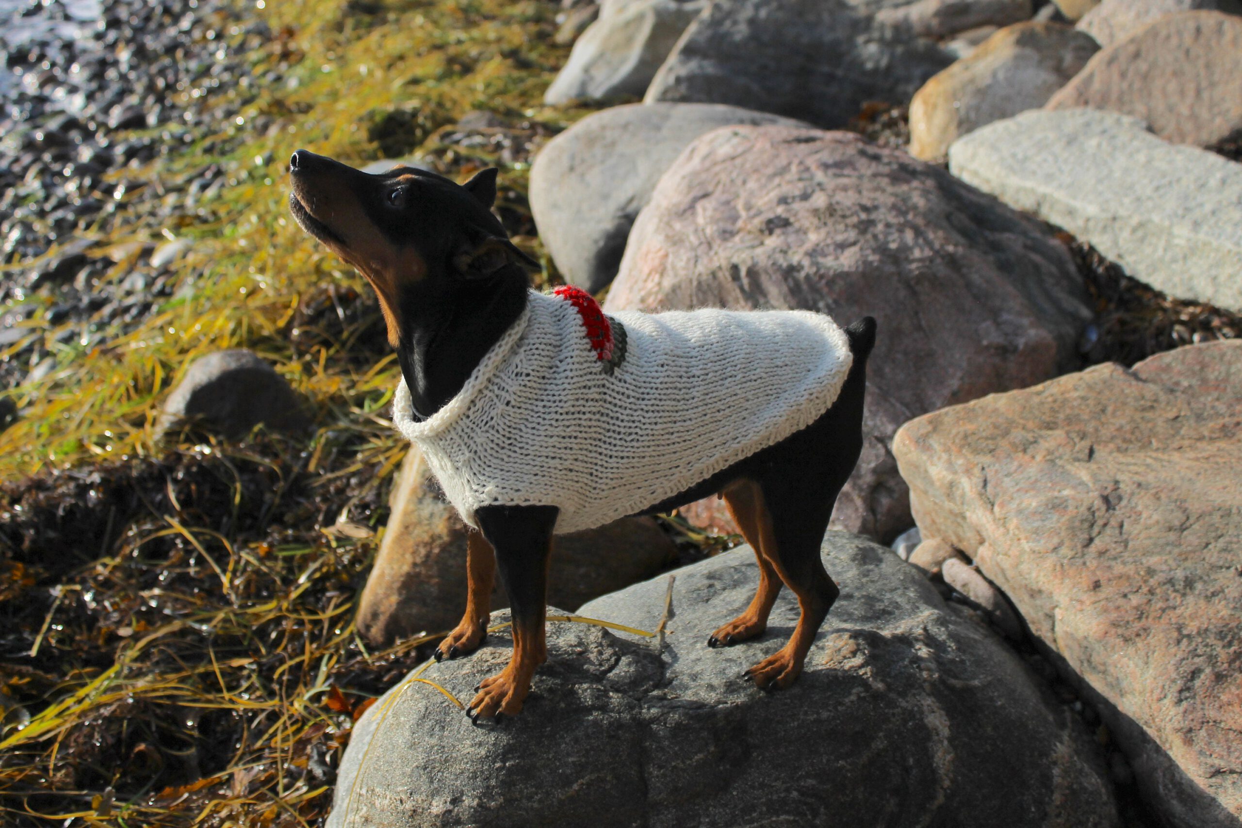 Perfect for colder weather because of warm yarn. Ideally suits smaller breeds such as chihuahua, russian toyterrier, pincher or yorkie, but we do make for any breed or even cats.