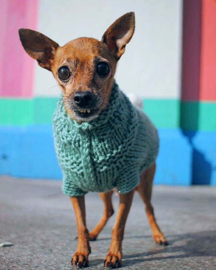 Handknitted woolly dog sweater with pompom for small dogs – super cute with pompom “tail”. Perfect for colder weather because of warm yarn. Ideally suits smaller breeds such as chihuahua, russian toyterrier, pincher or yorkie, but we do make for any breed or even cats.
