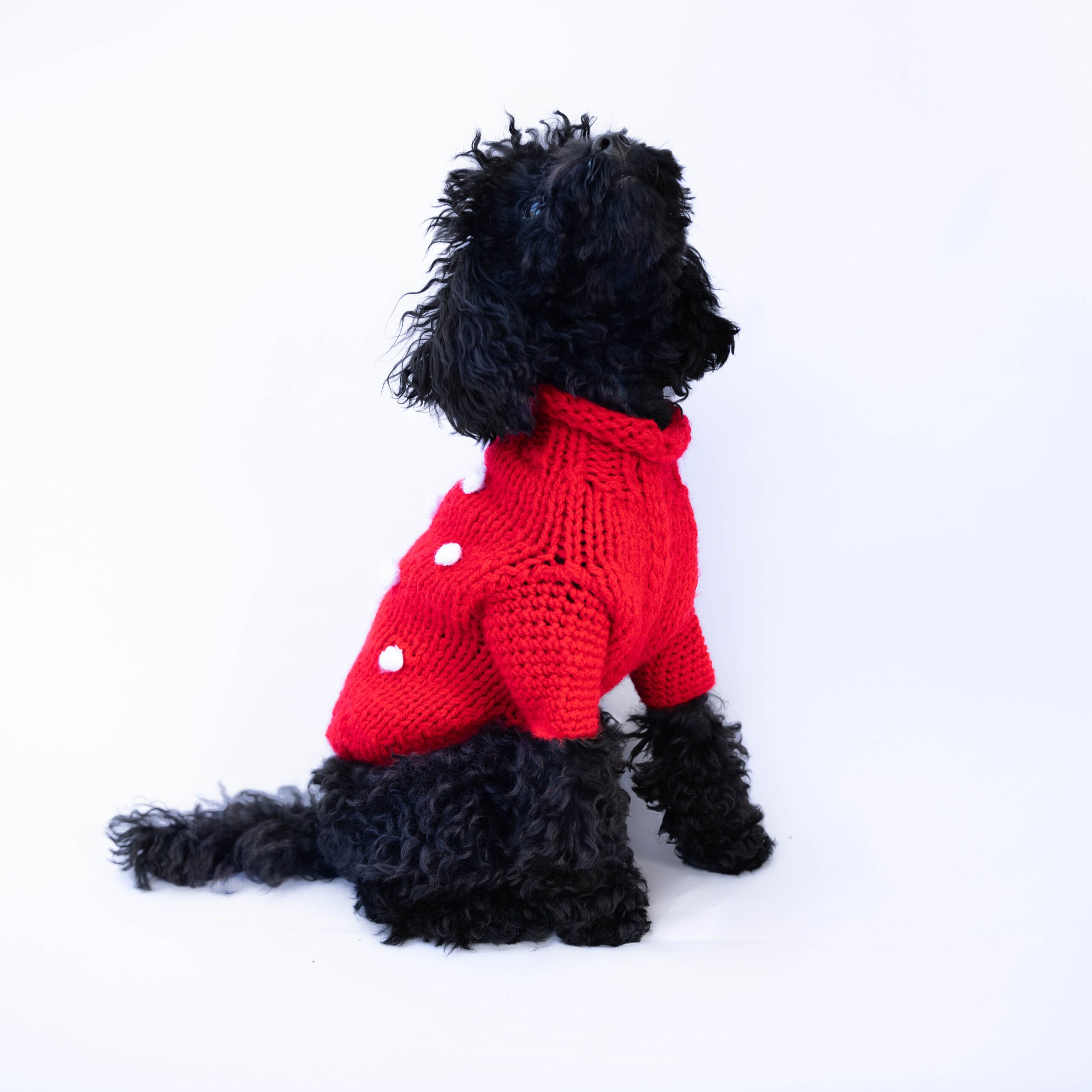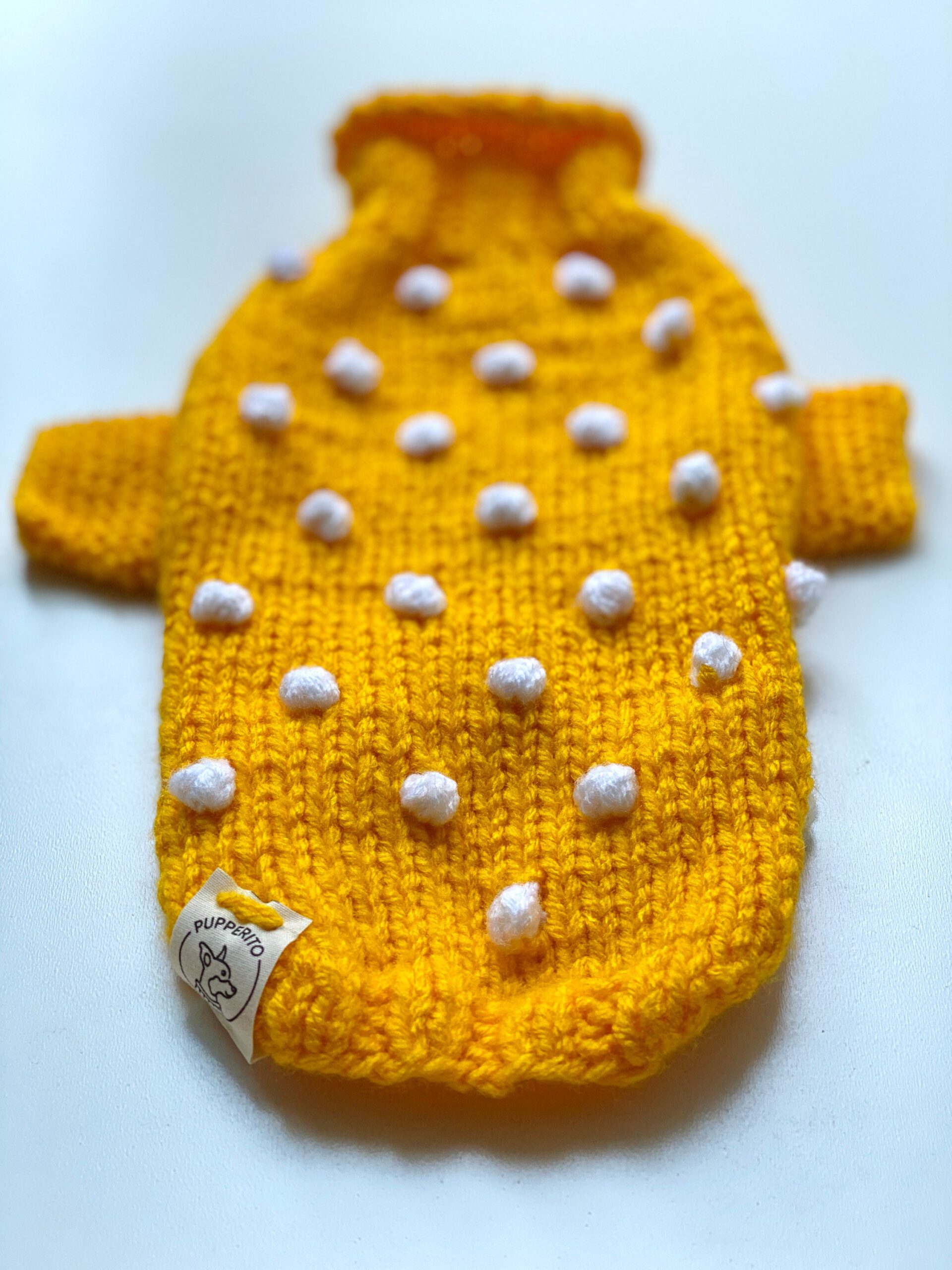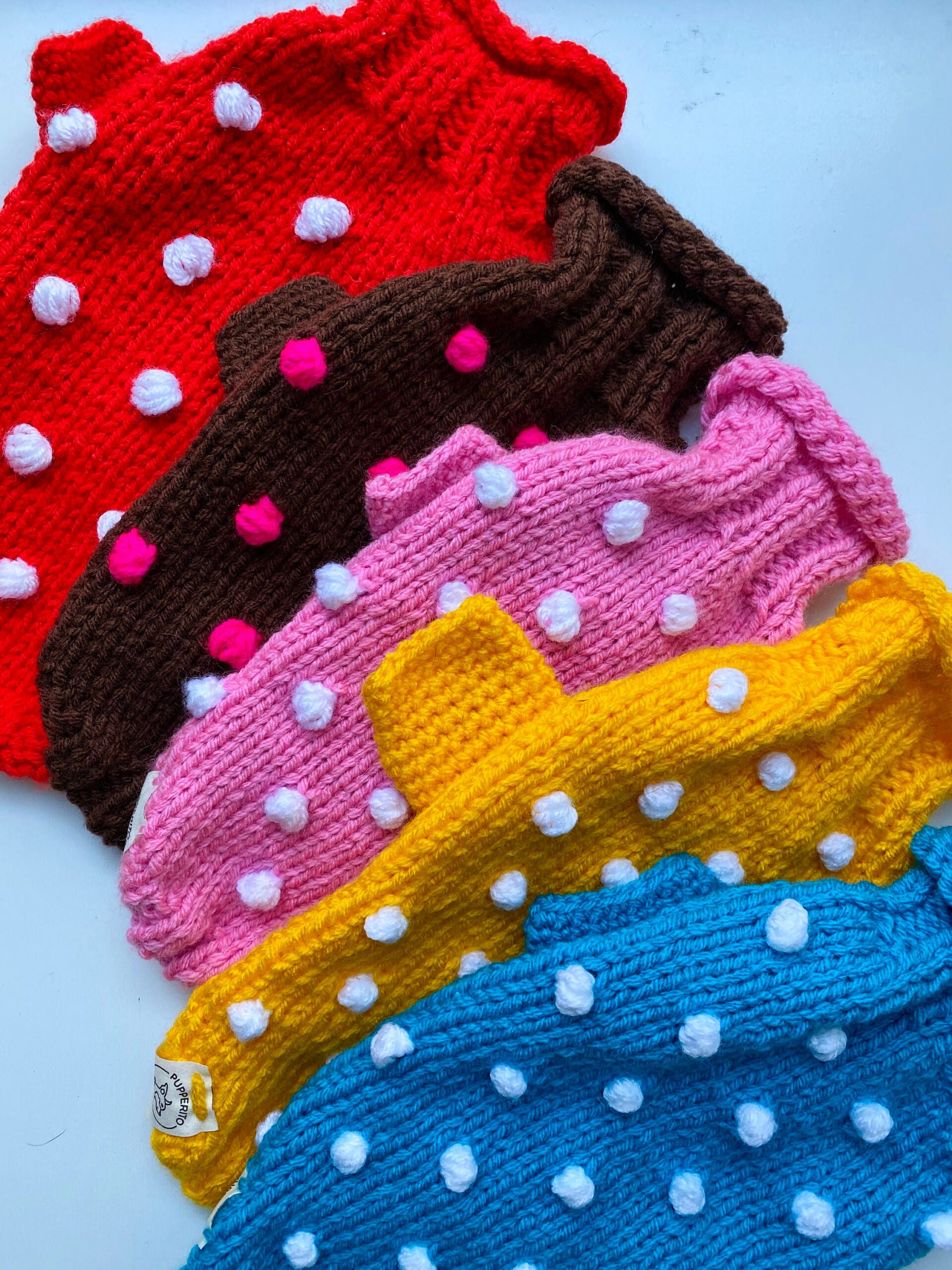 Handknitted woolly sweater for small dogs with pompoms – super cute and 100% handmade. Perfect for colder weather because of warm yarn. Ideally suits smaller breeds such as chihuahua, russian toyterrier, iggy, pincher or yorkie, but we do make for any breed or even cats.