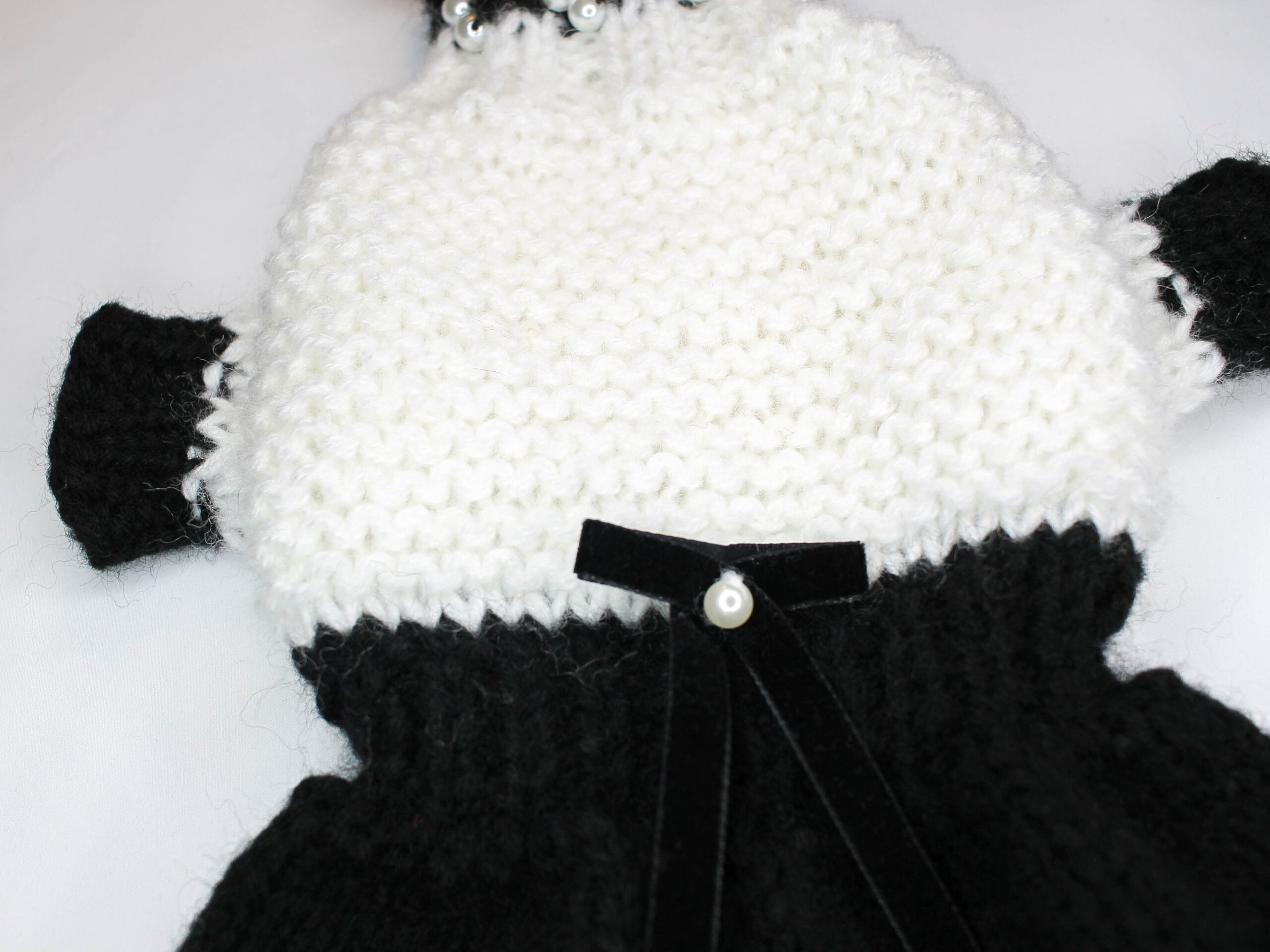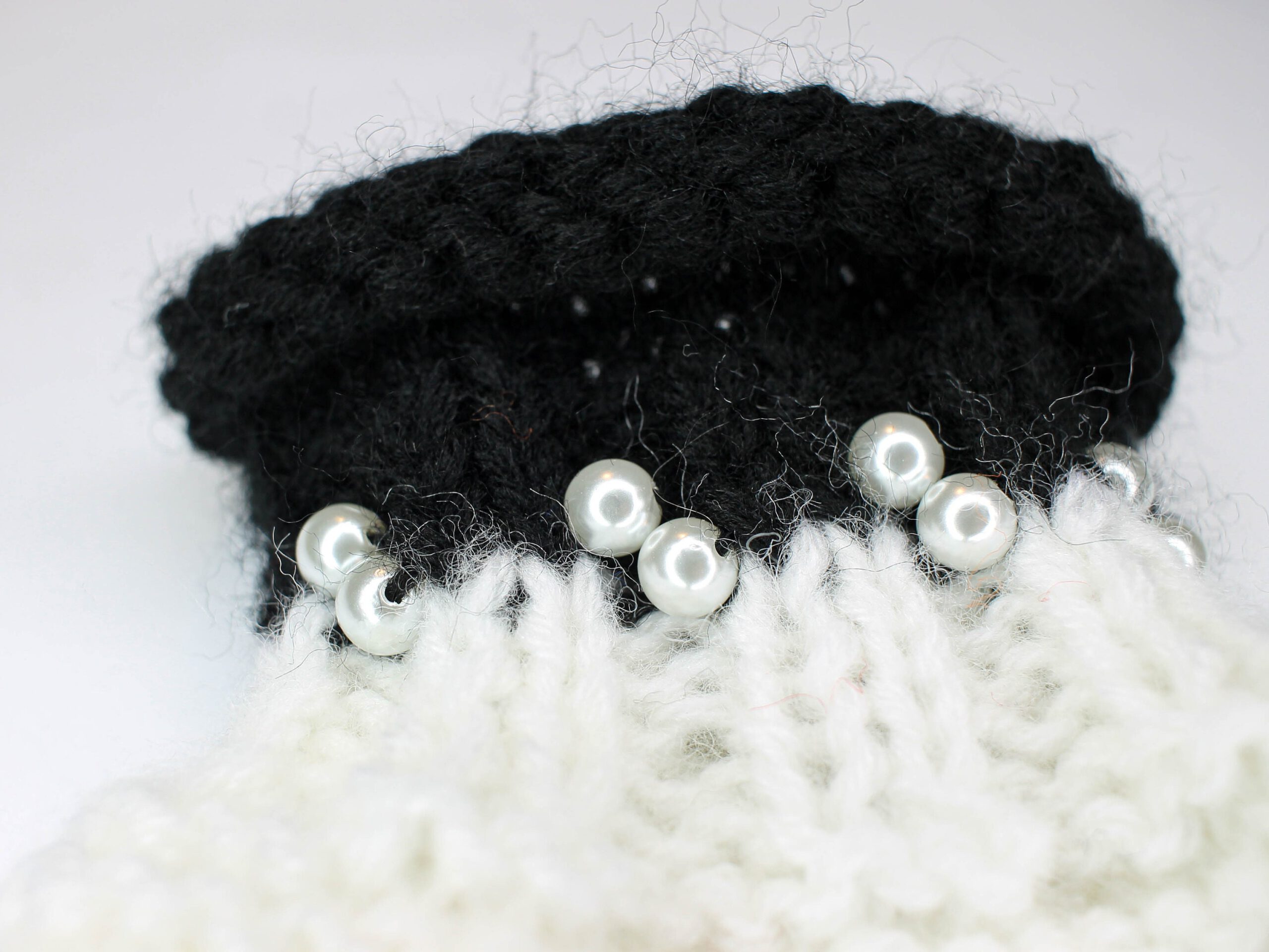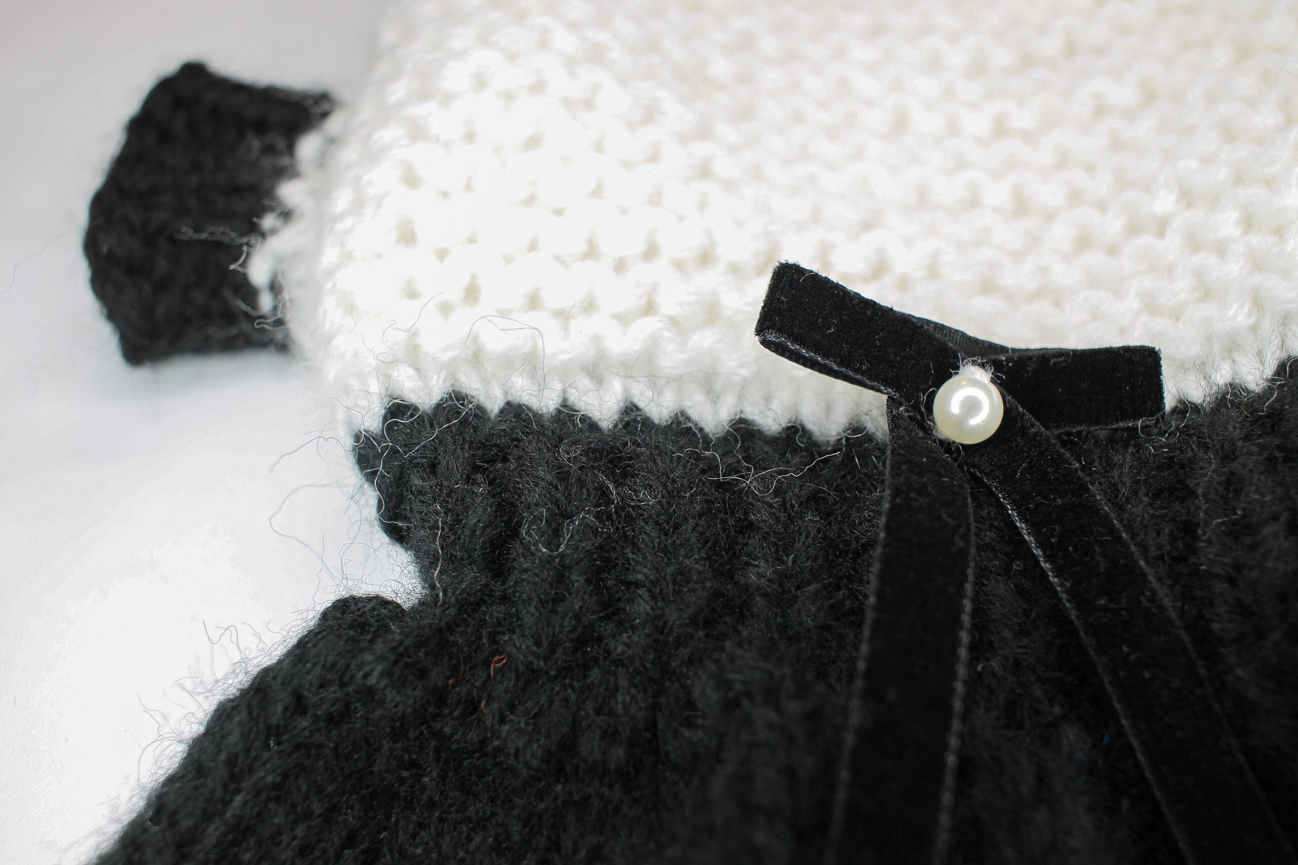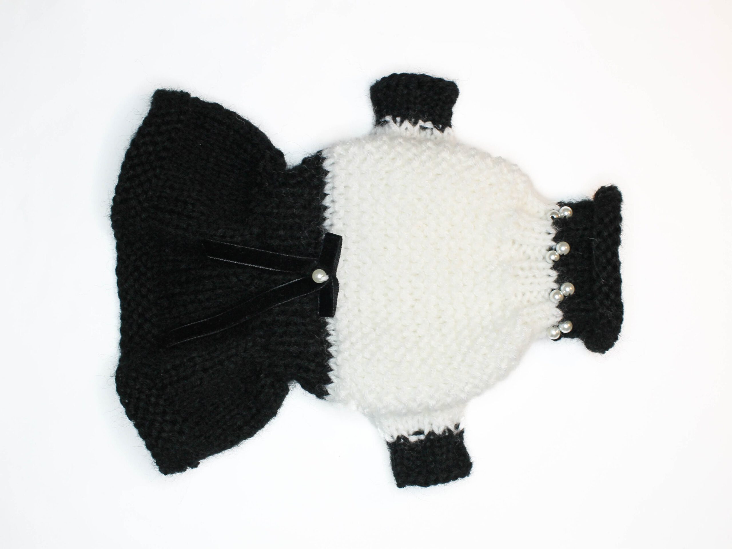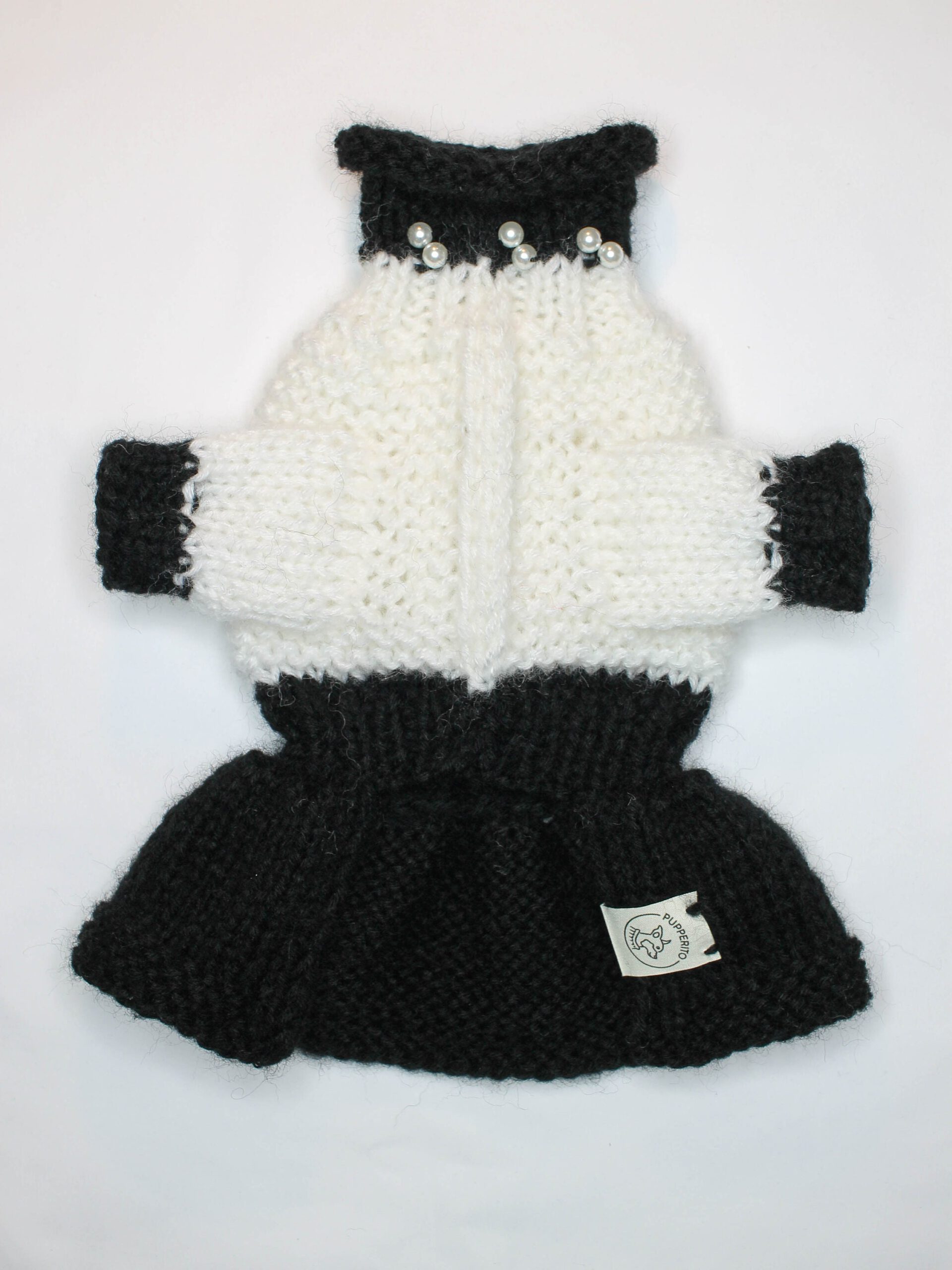 Handmade Chanel style wool dog dress in black and white with sleeves – “Fancy Pawnda”. Perfect for colder weather because of natural wool. Comfortable and glamorous, for everyday or for occasion. Faux pearls and a velor ribbon add an extra touch. Ideally suits smaller breeds such as chihuahua, russian toyterrier, pincher or yorkie, but we do make for any breed or even cats.
