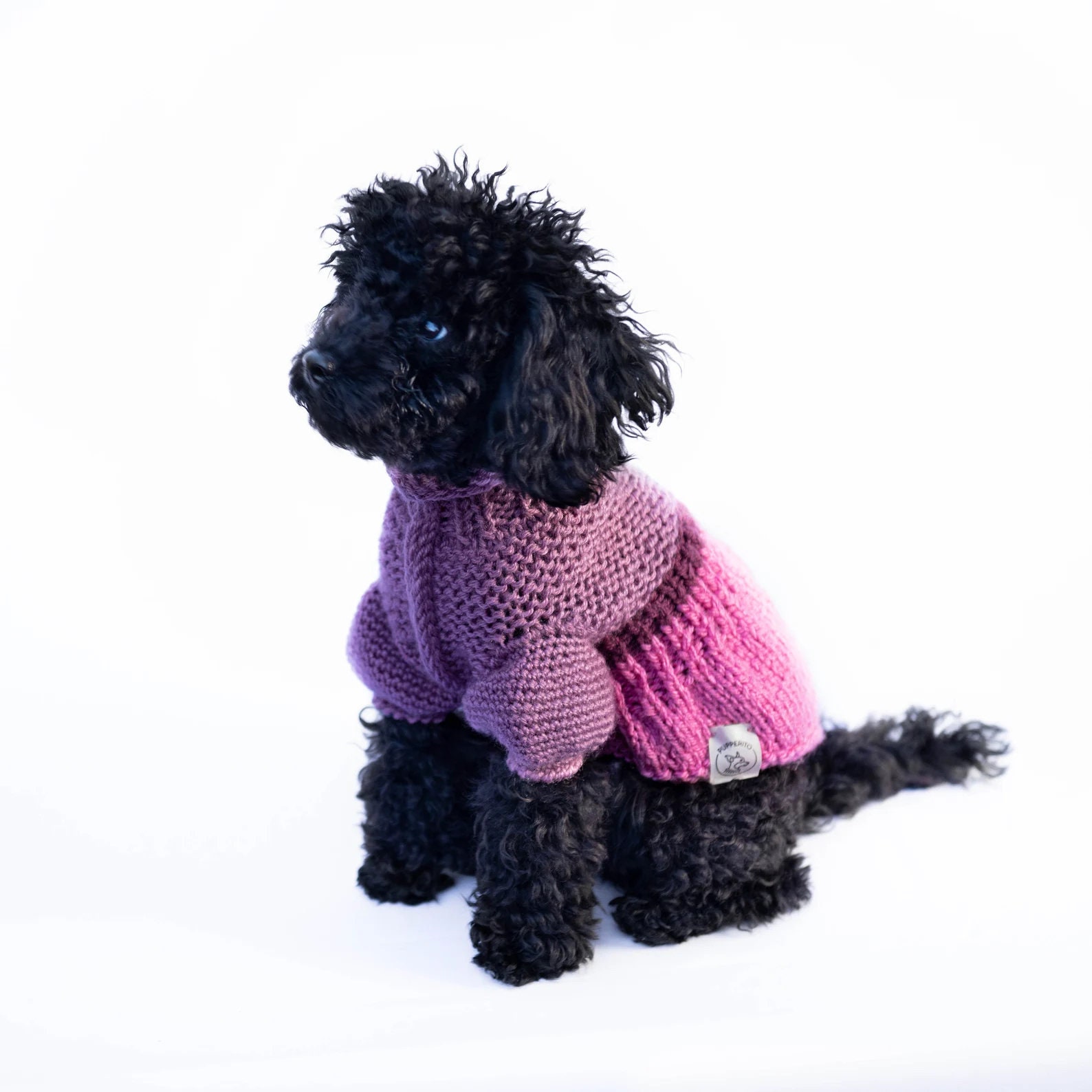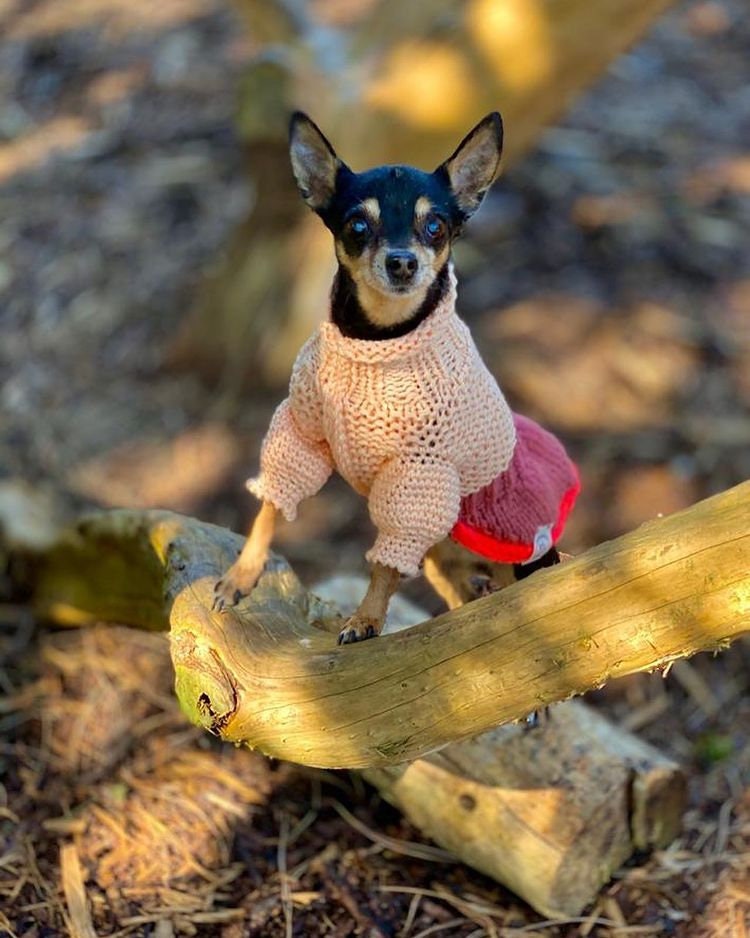 Super cute hand knitted dog sweater in bold and bright colors with puffy sleeves. Perfect for colder weather because of warm yarn. Ideally suits smaller breeds such as chihuahua, russian toyterrier, pincher or yorkie, but we do make for any breed or even cats.
