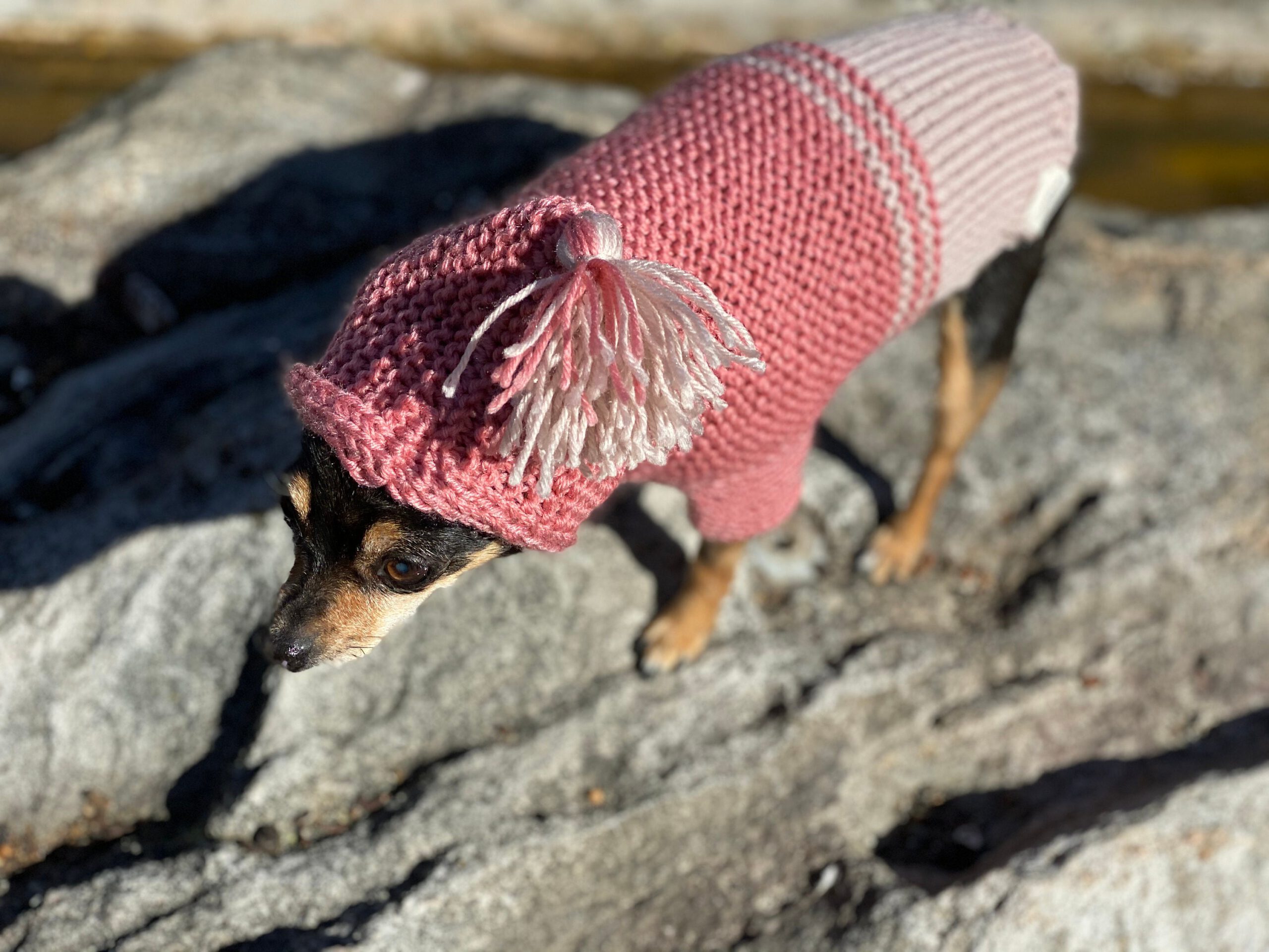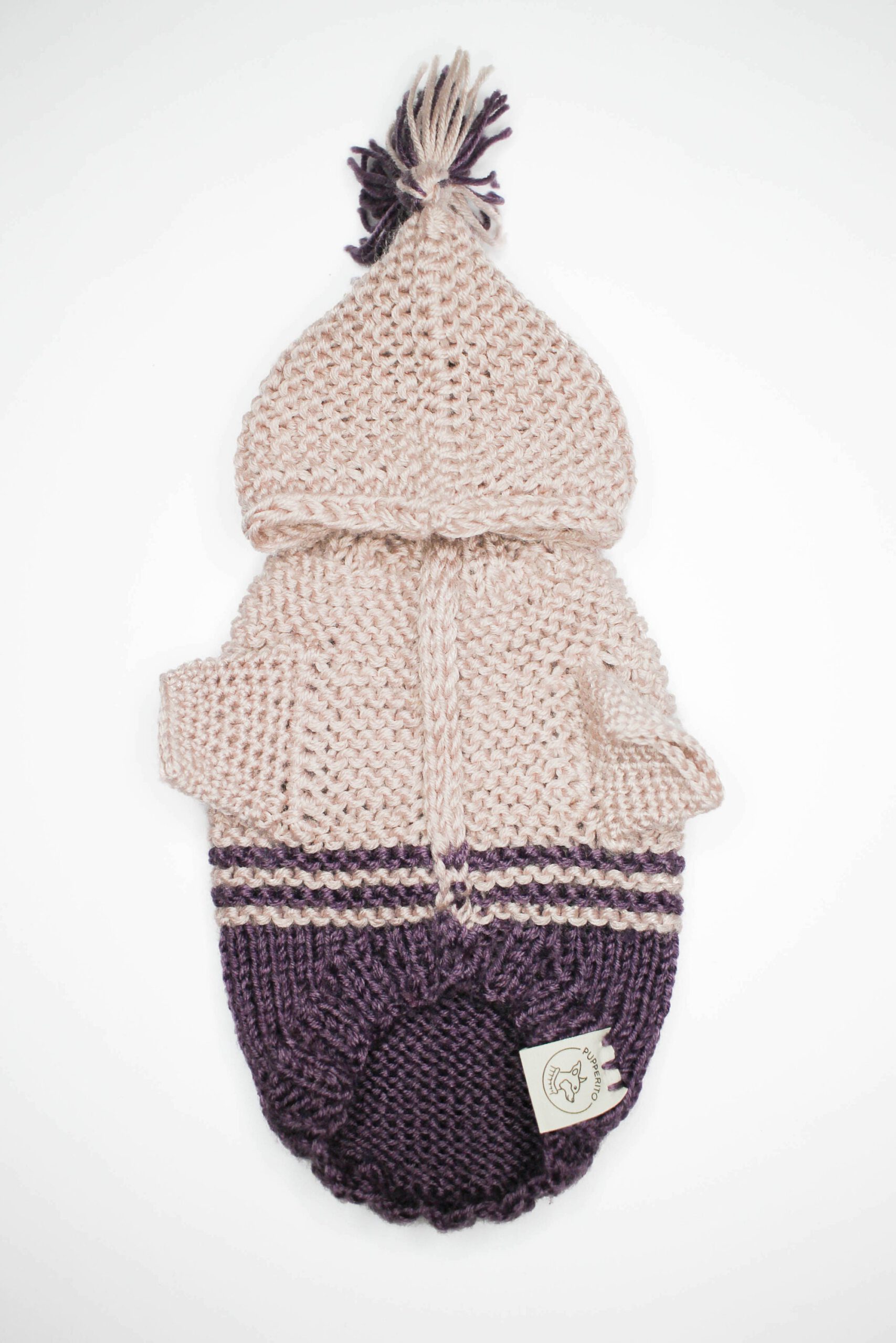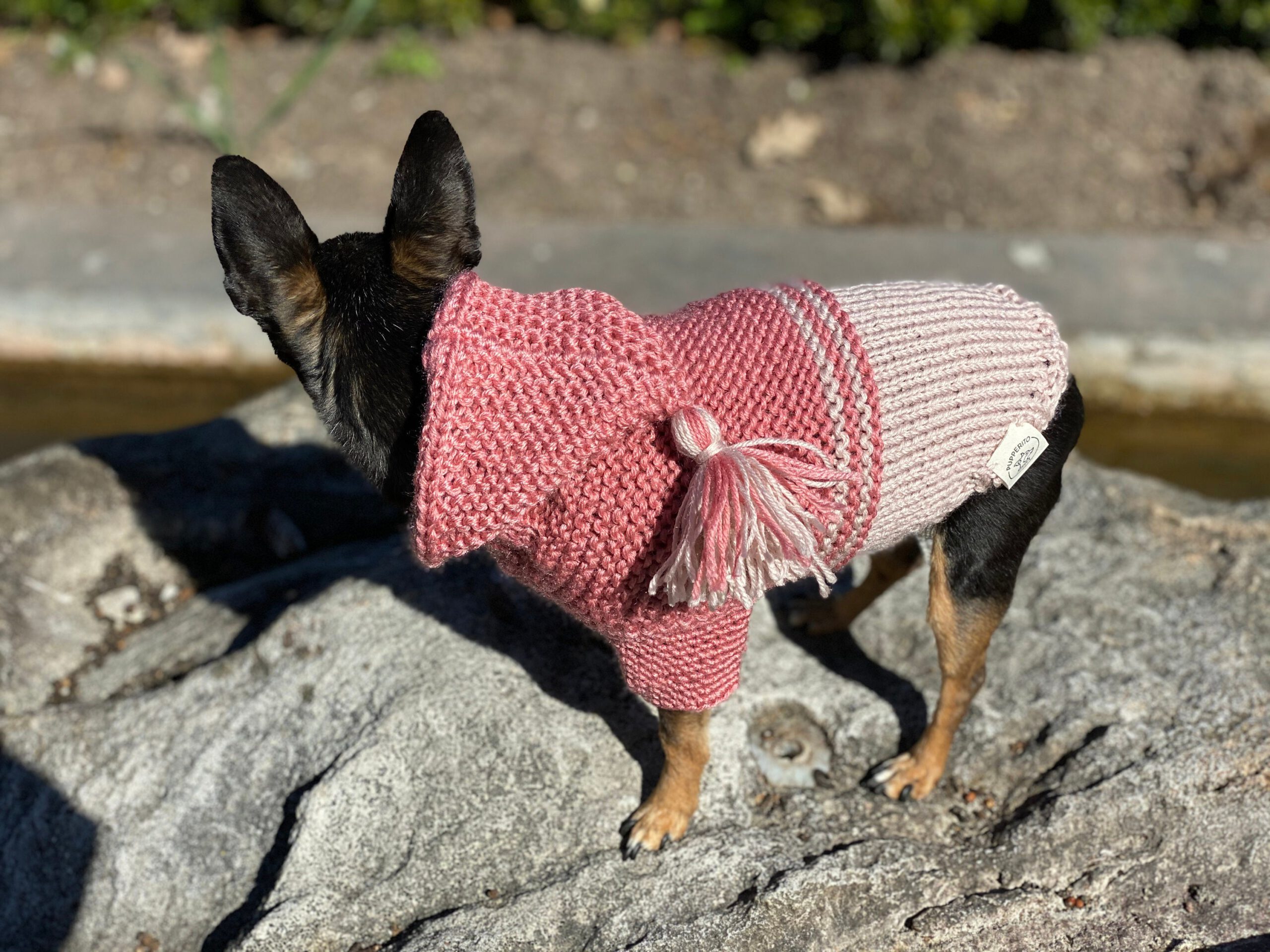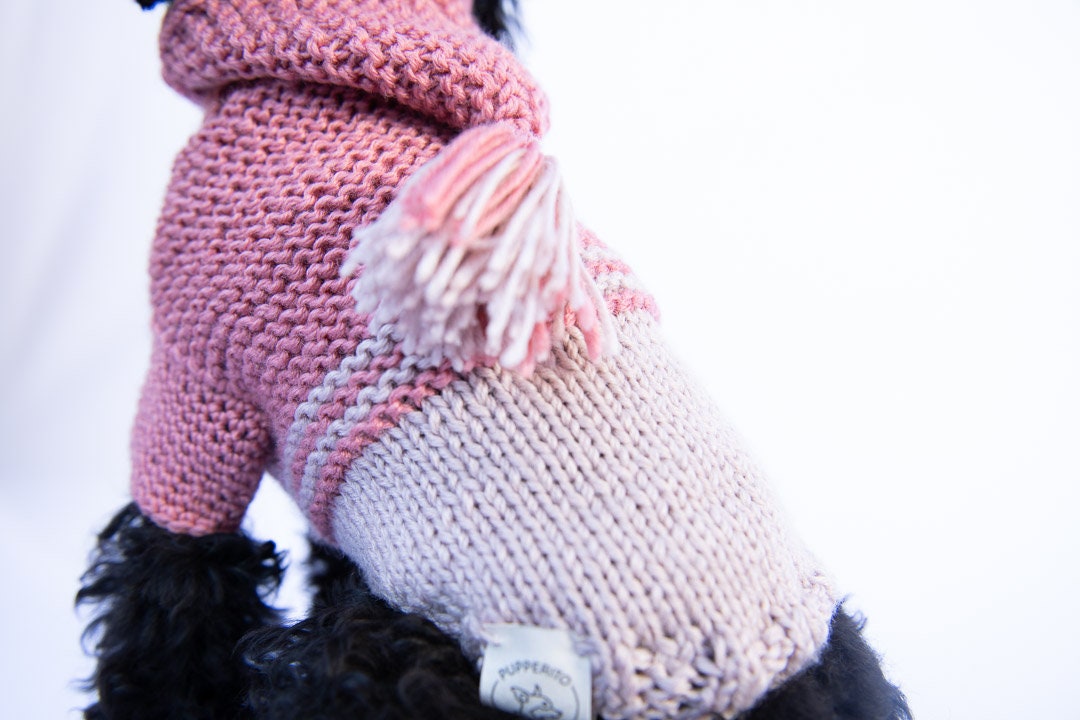 Handmade dog sweater with hoodie for small dogs – super cute and environmentally friendly – in sustainable recycled plastic. Available in salmon pink and purple. Perfect fit for smaller breeds such as chihuahua, russian toyterrier, pincher or yorkie but we do make for any breeds or even cats.