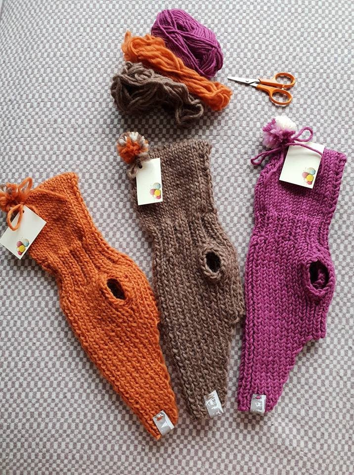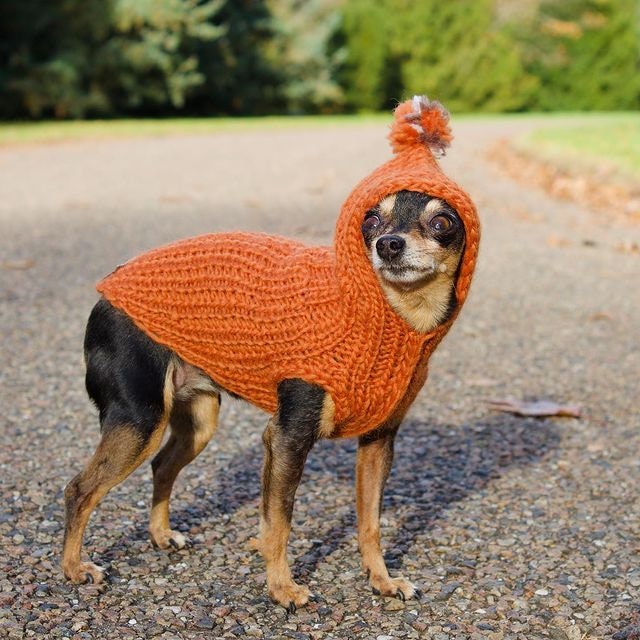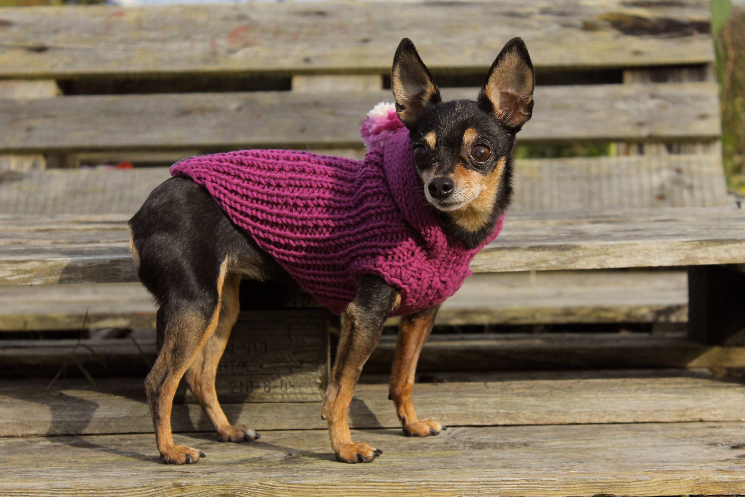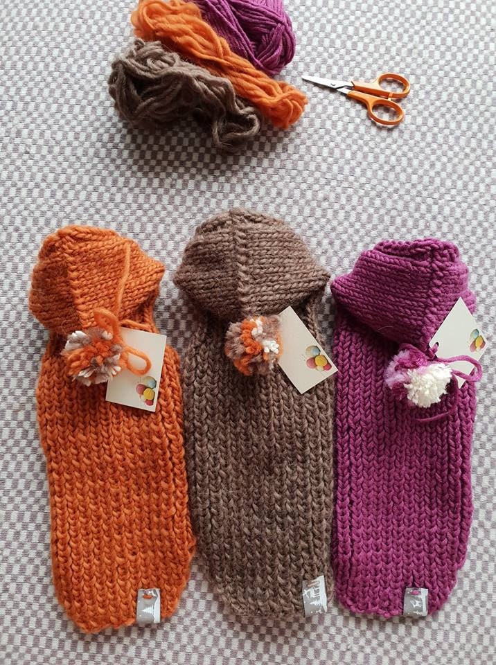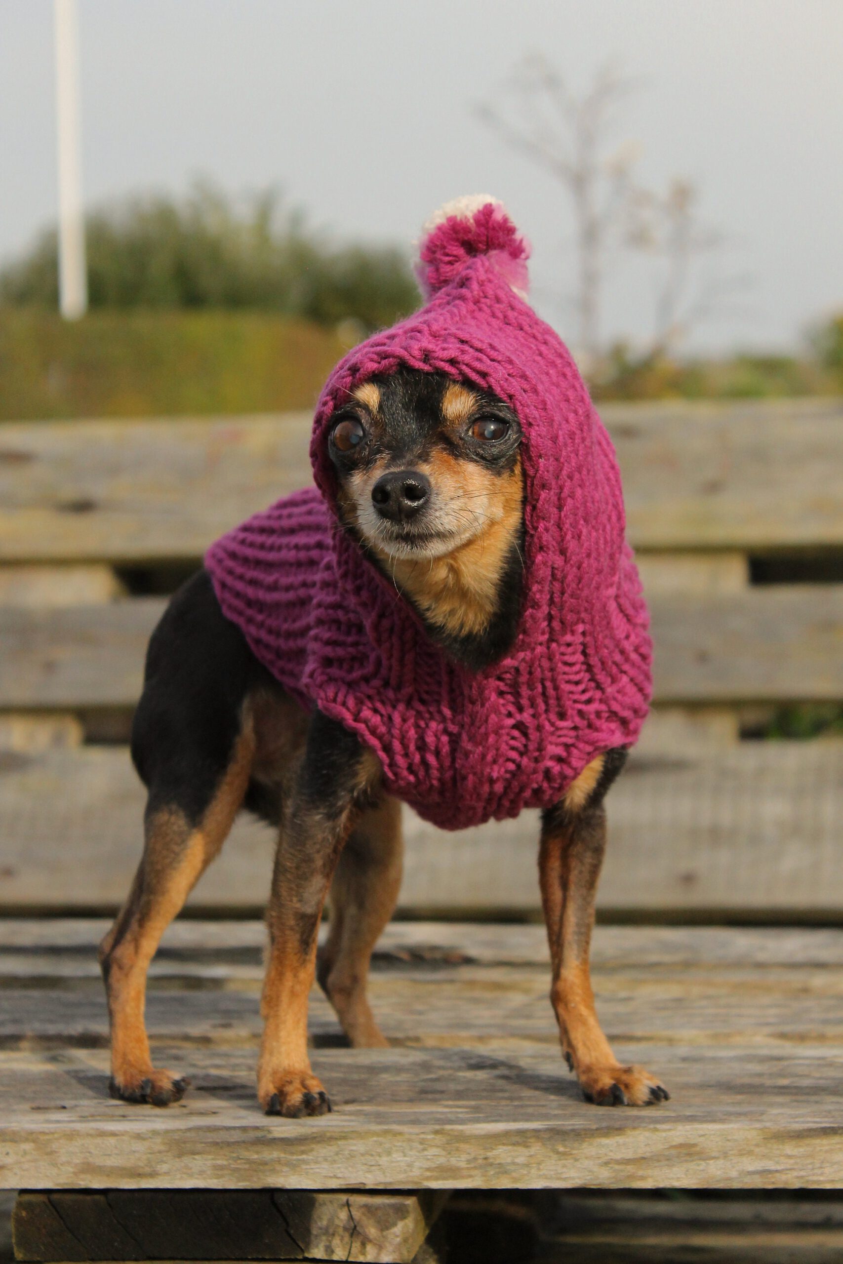 Super cute hand knitted woolly dog sweater with pompom hoodie. Perfect for colder and warmer weather because of natural materials.