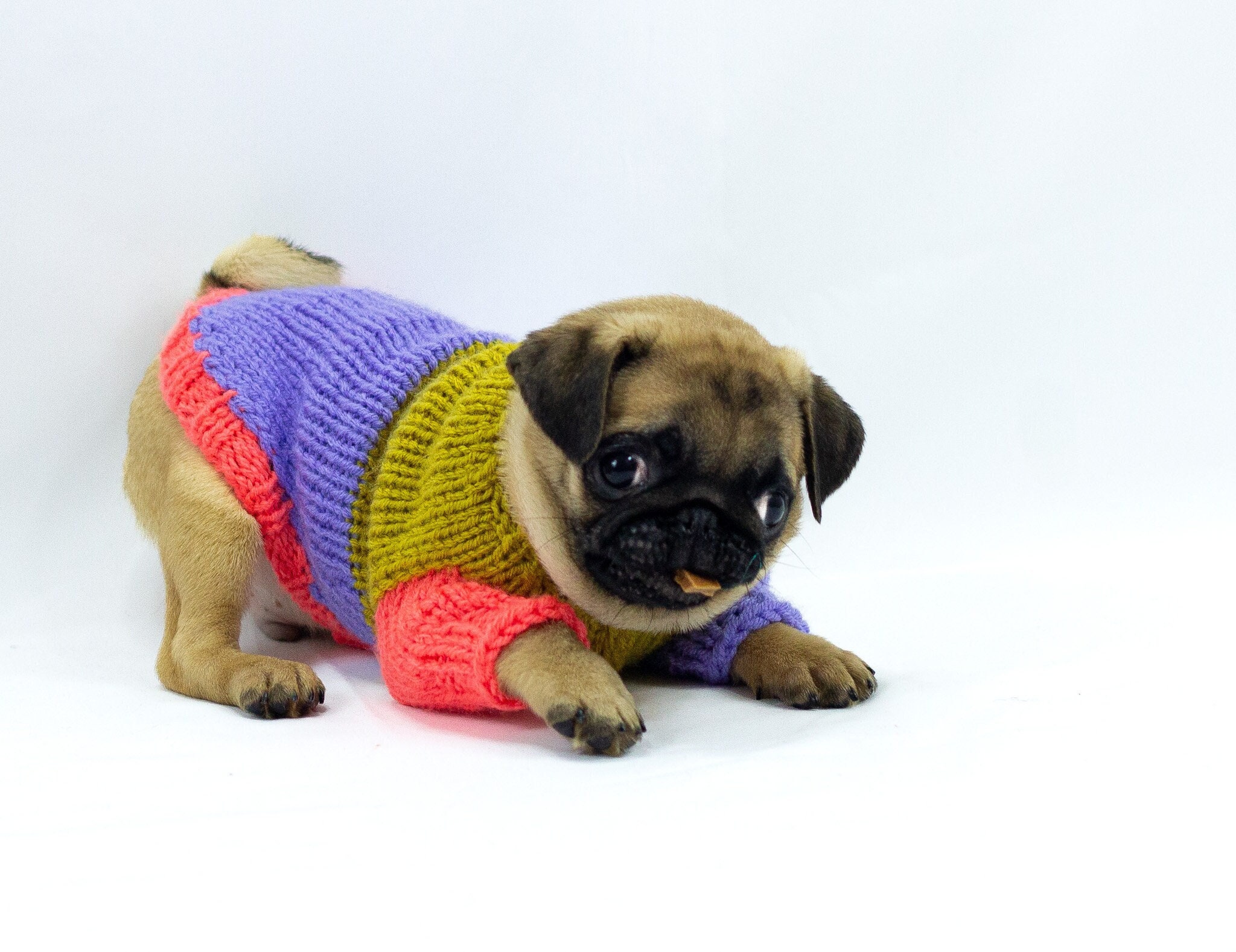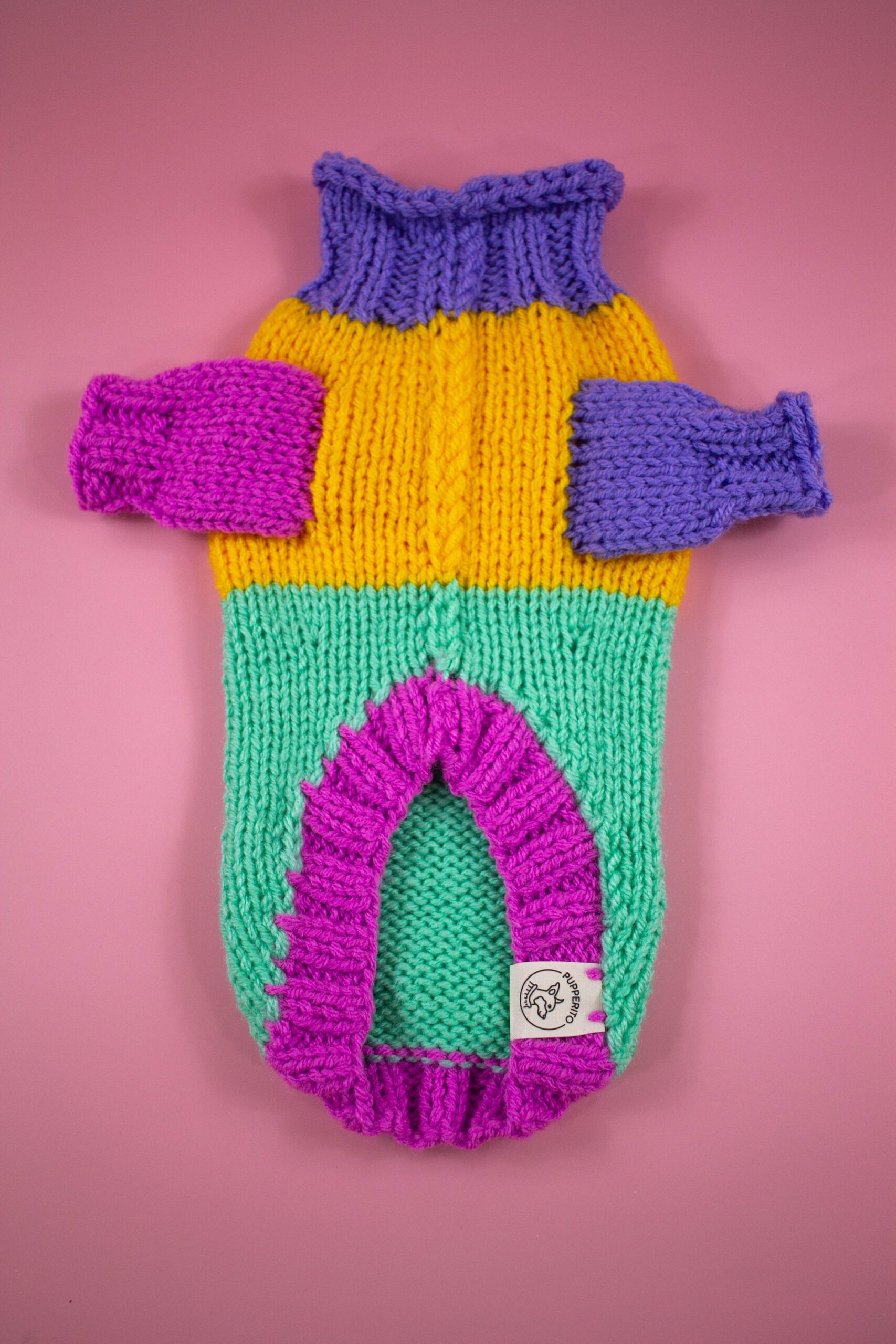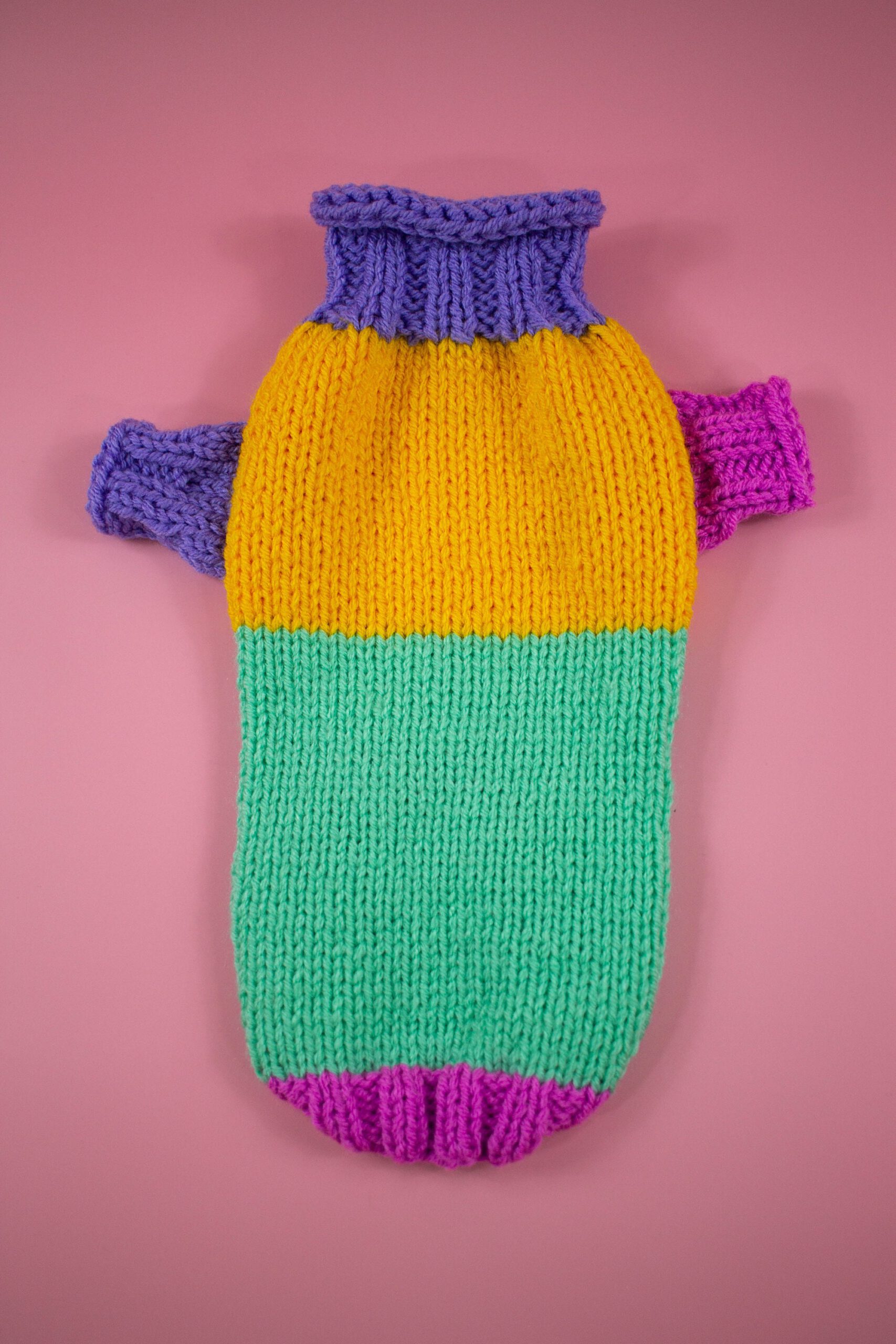 Handmade knitted wool blend dog sweater for small dogs in colour block – bright and unique, with longs sleeves, all handmade. Perfect for colder weather because of wool blend (quality wool and acryl). Ideally suits smaller breeds such as chihuahua, russian toyterrier, pincher, iggy or yorkie, but we do make for any breed or even cats.