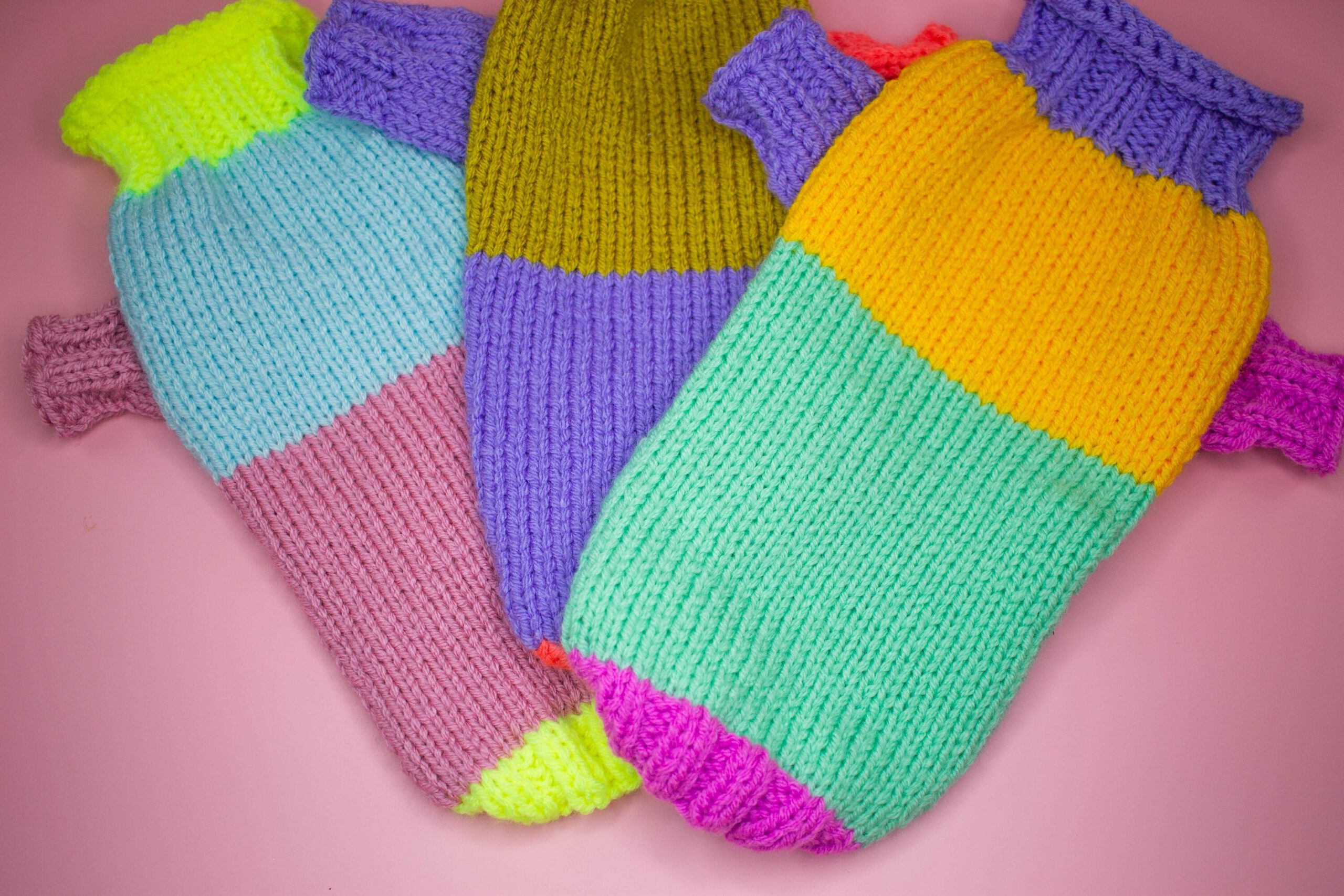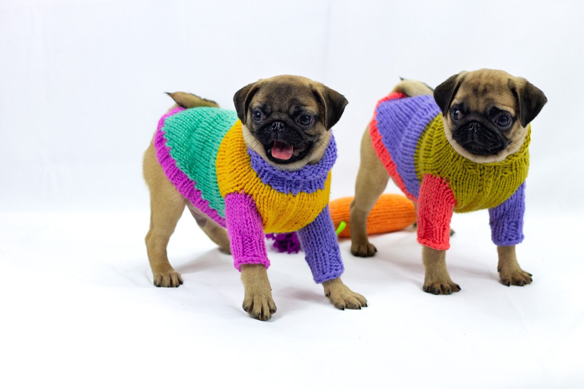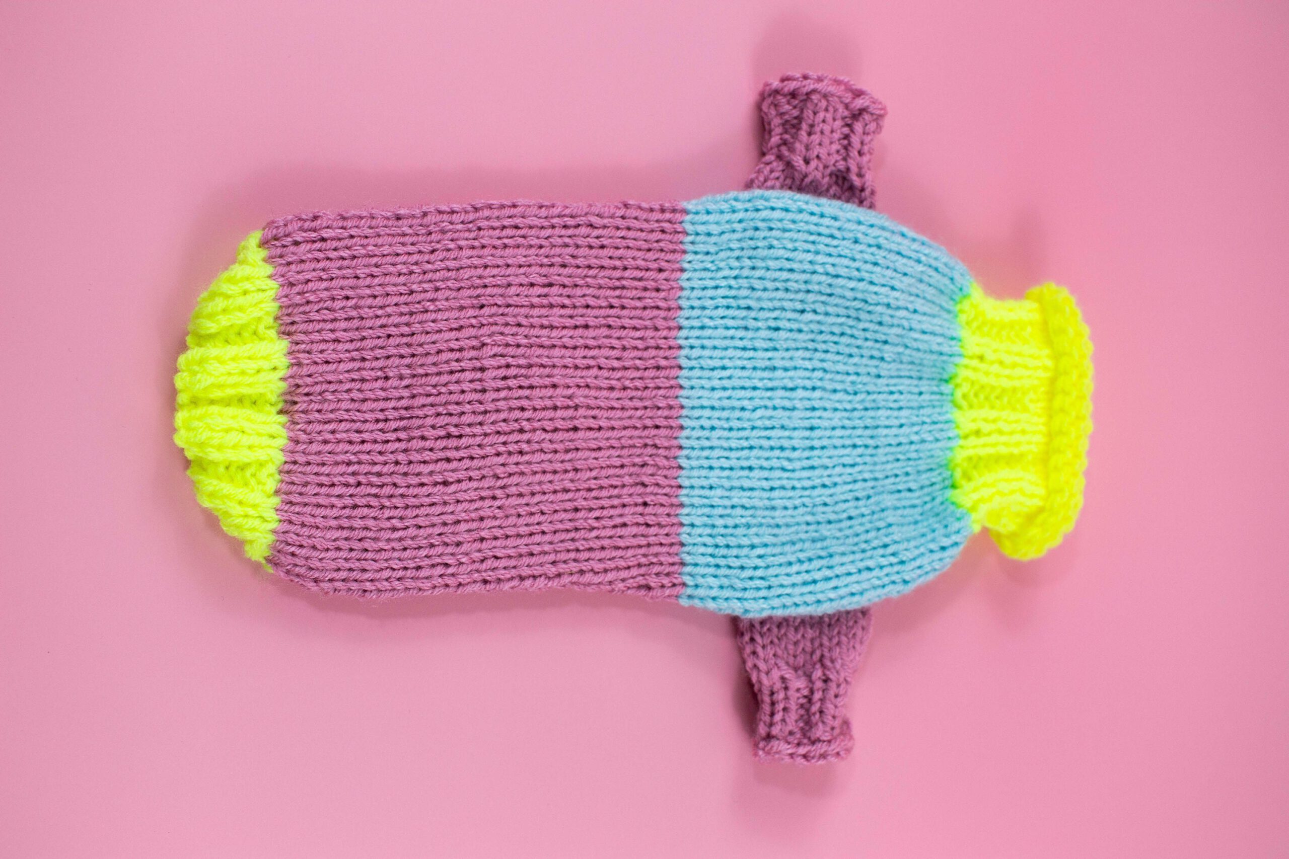 Handmade knitted wool blend dog sweater for small dogs in colour block – bright and unique, with longs sleeves, all handmade. Perfect for colder weather because of wool blend (quality wool and acryl). Ideally suits smaller breeds such as chihuahua, russian toyterrier, pincher, iggy or yorkie, but we do make for any breed or even cats.